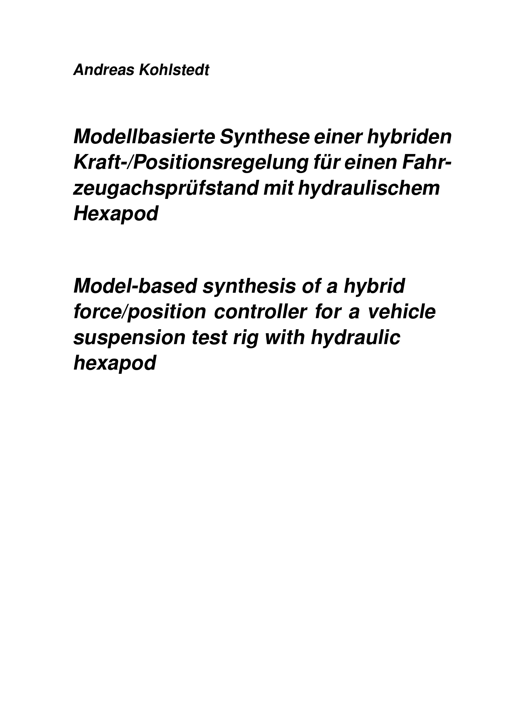Modellbasierte Synthese einer hybriden Kraft-/Positionsregelung für einen Fahrzeugachsprüfstand mit hydraulischem Hexapod / Andreas Kohlstedt ; [Referent: Prof. Dr.-Ing. Ansgar Trächtler, Korreferent: Prof. Dr.-Ing. Günter Roppenecker]