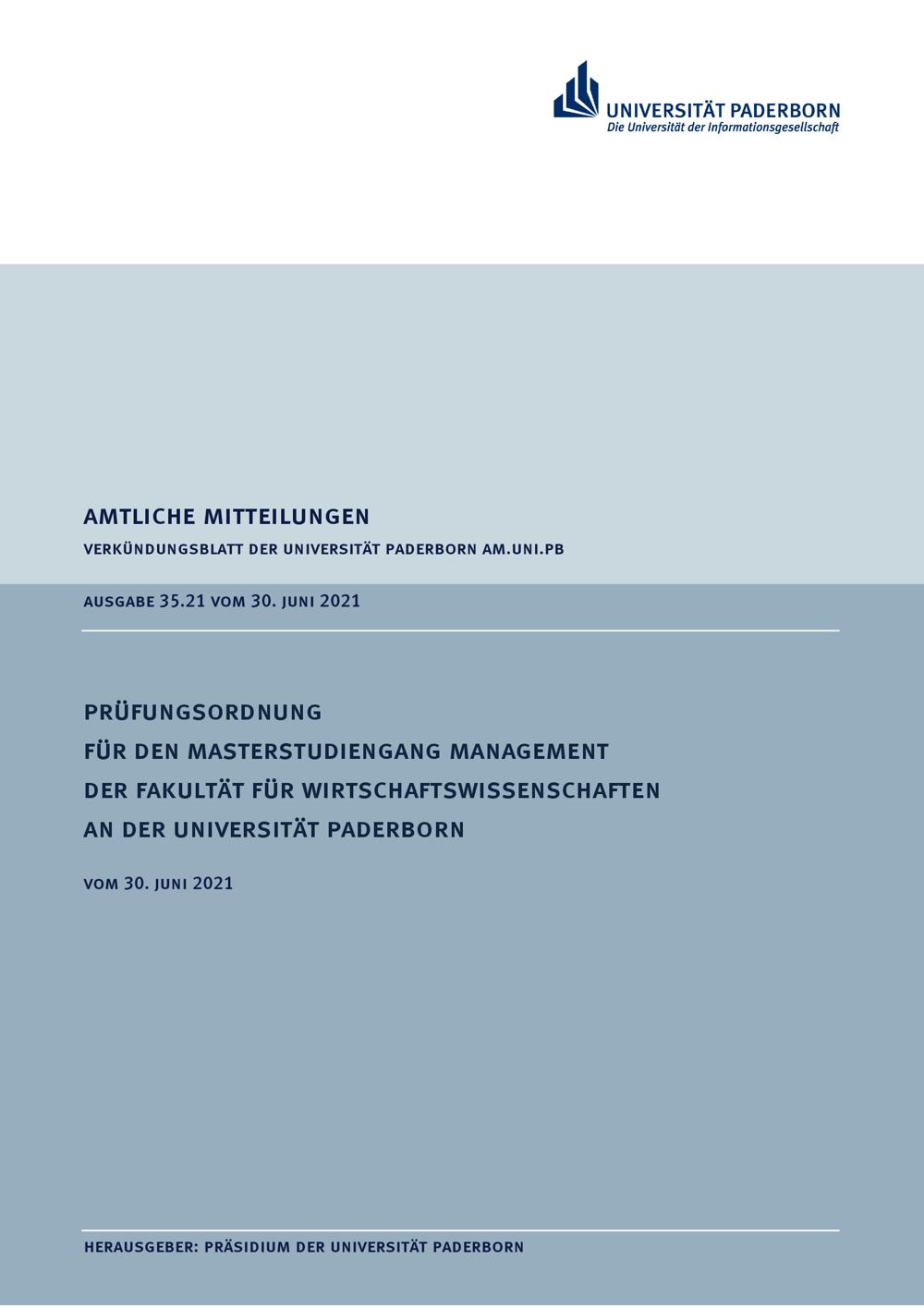 Prüfungsordnung für den Masterstudiengang Management der Fakultät für Wirtschaftswissenschaften an der Universität Paderborn : vom 30. Juni 2021