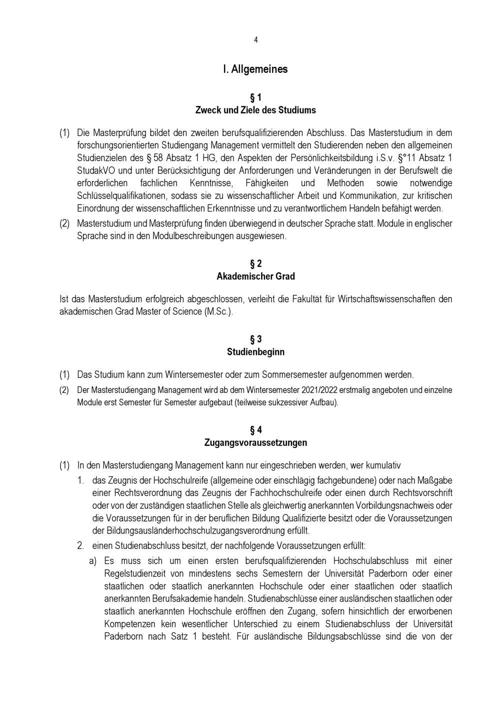 Prüfungsordnung für den Masterstudiengang Management der Fakultät für Wirtschaftswissenschaften an der Universität Paderborn : vom 30. Juni 2021