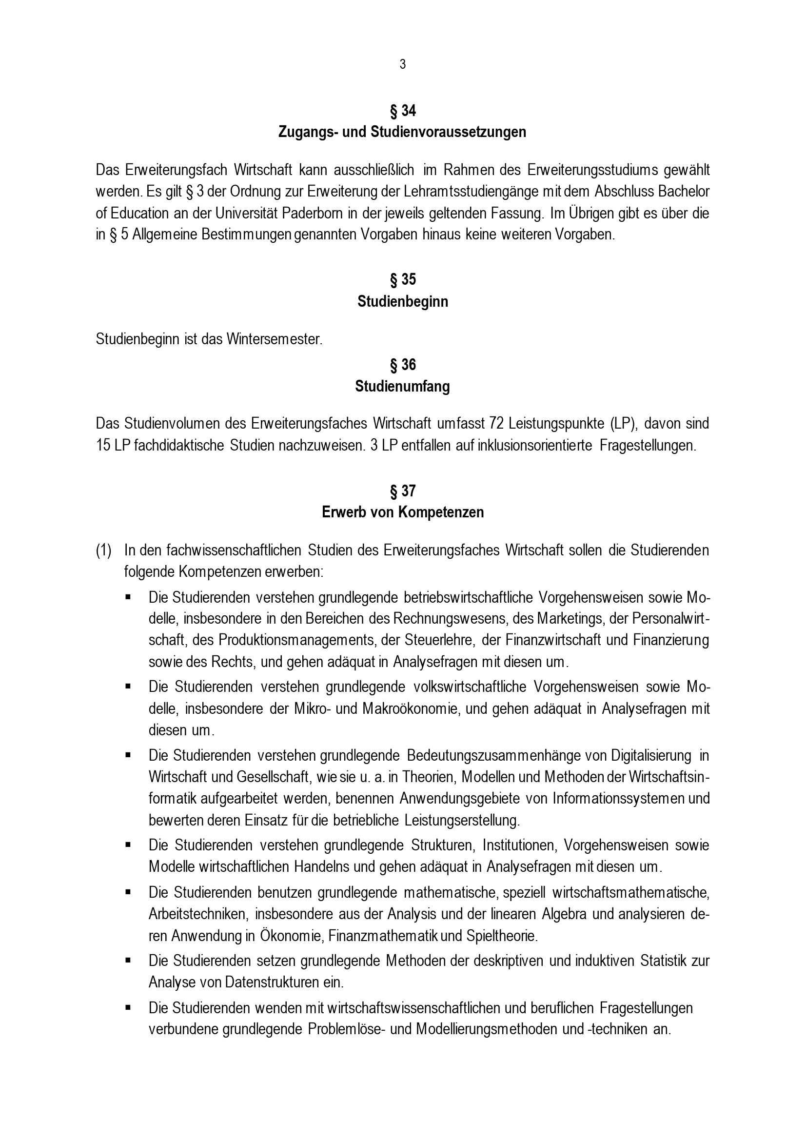 Besondere Bestimmungen der Prüfungsordnung für den Bachelorstudiengang Lehramt an Gymnasien und Gesamtschulen mit dem Erweiterungsfach Wirtschaft an der Universität Paderborn : vom 12. Juli 2021