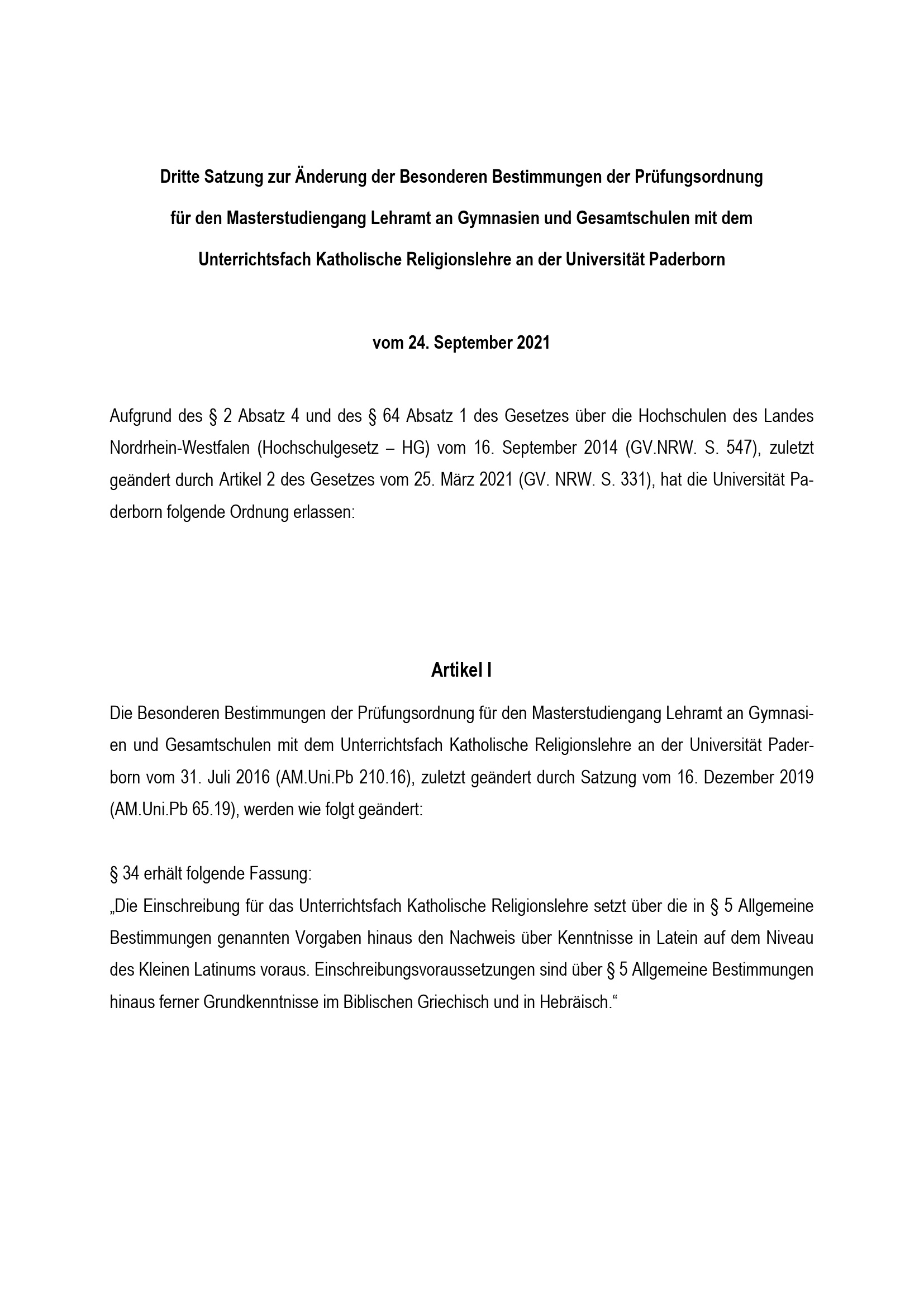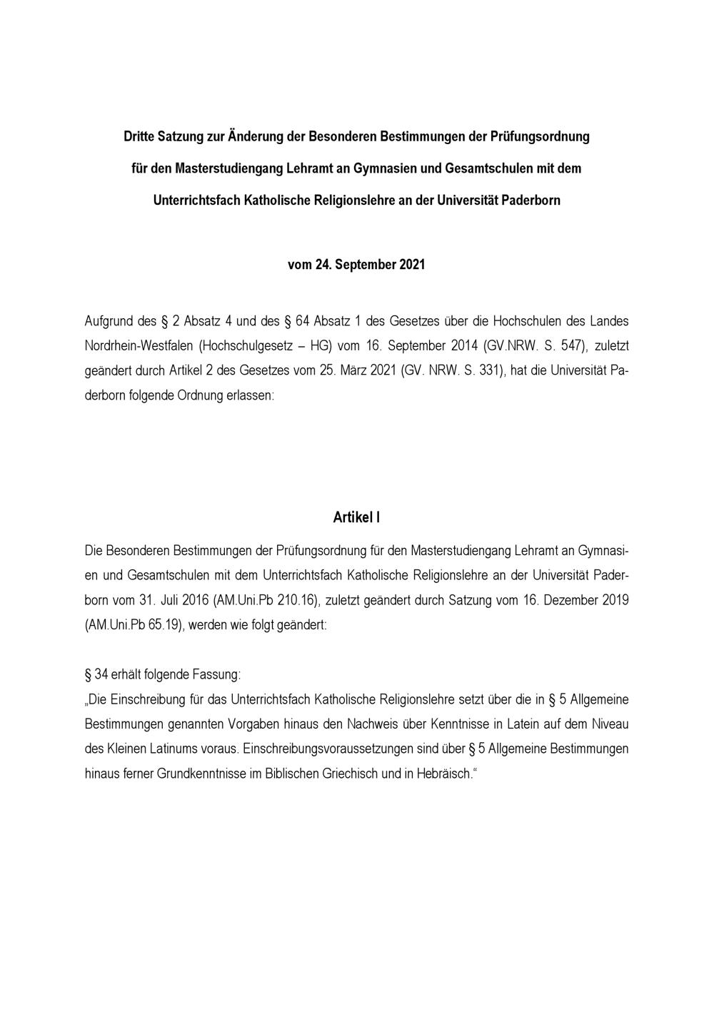 Dritte Satzung zur Änderung der Besonderen Bestimmungen der Prüfungsordnung für den Masterstudiengang Lehramt an Gymnasien und Gesamtschulen mit dem Unterrichtsfach Katholische Religionslehre an der Universität Paderborn : vom 24. September 2021
