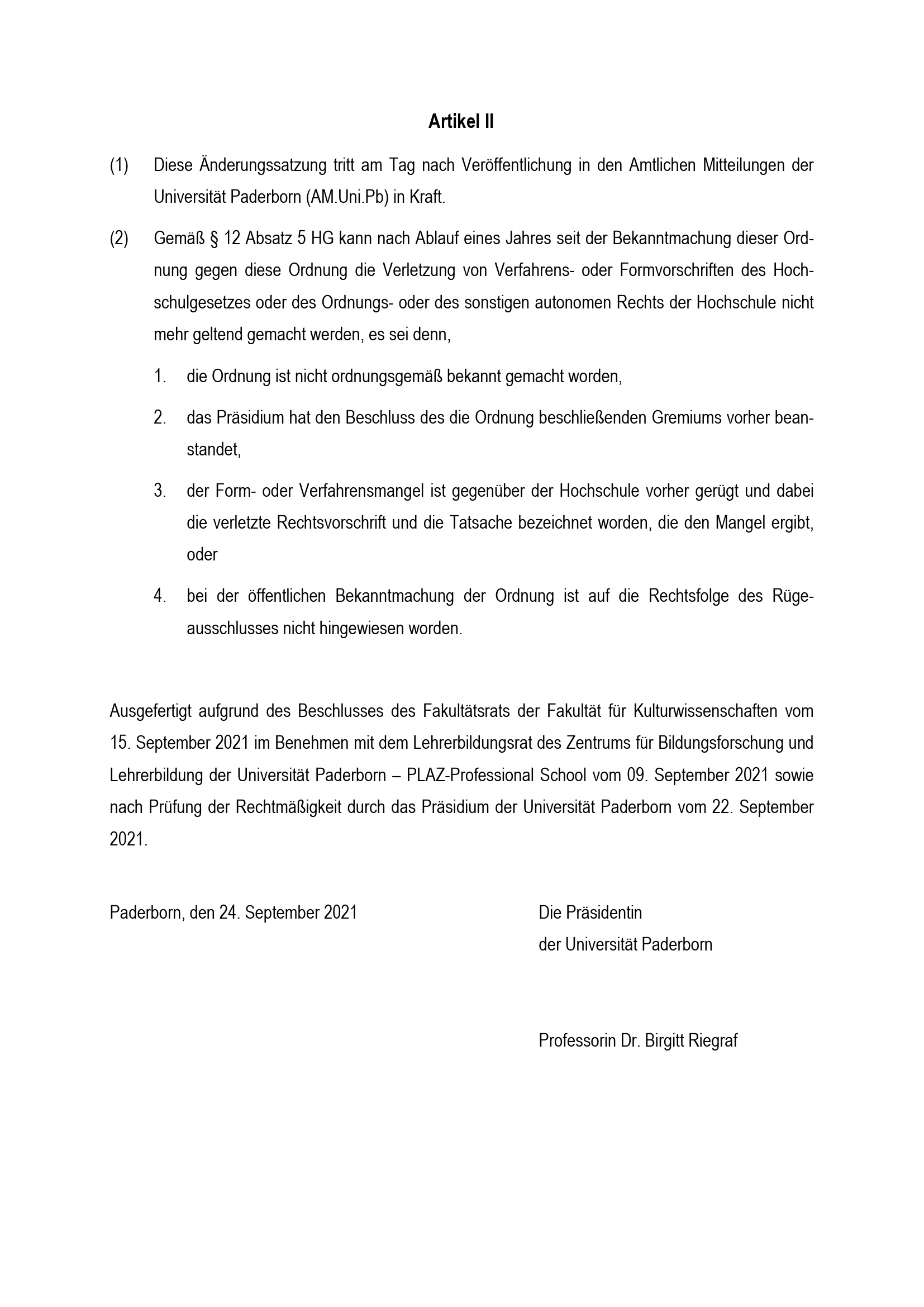 Dritte Satzung zur Änderung der Besonderen Bestimmungen der Prüfungsordnung für den Masterstudiengang Lehramt an Gymnasien und Gesamtschulen mit dem Unterrichtsfach Katholische Religionslehre an der Universität Paderborn : vom 24. September 2021