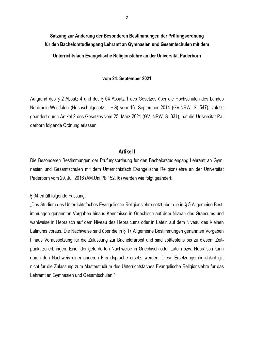 Satzung zur Änderung der Besonderen Bestimmungen der Prüfungsordnung für den Bachelorstudiengang Lehramt an Gymnasien und Gesamtschulen mit dem Unterrichtsfach Evangelische Religionslehre an der Universität Paderborn : vom 24. September 2021