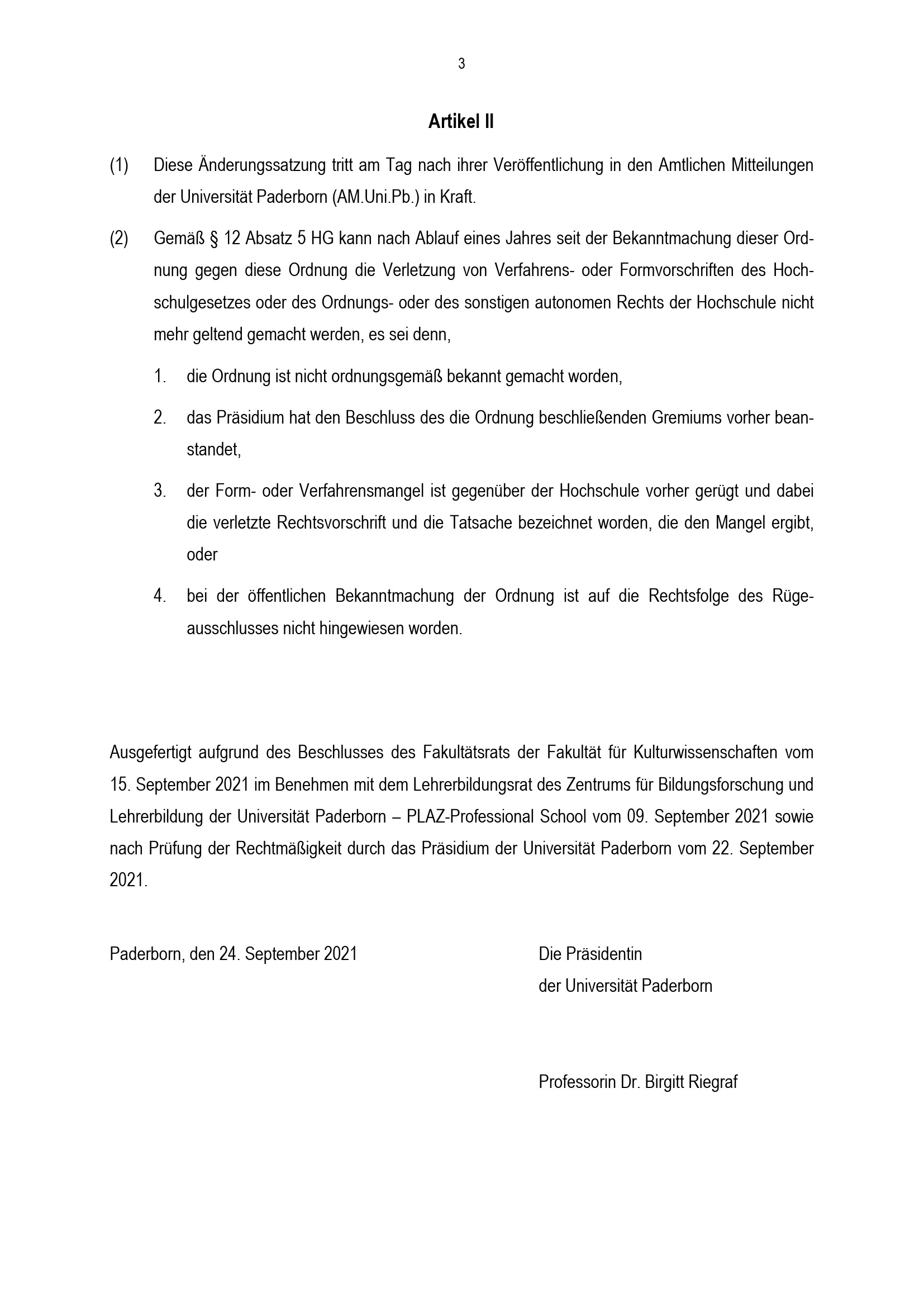 Satzung zur Änderung der Besonderen Bestimmungen der Prüfungsordnung für den Bachelorstudiengang Lehramt an Gymnasien und Gesamtschulen mit dem Unterrichtsfach Evangelische Religionslehre an der Universität Paderborn : vom 24. September 2021
