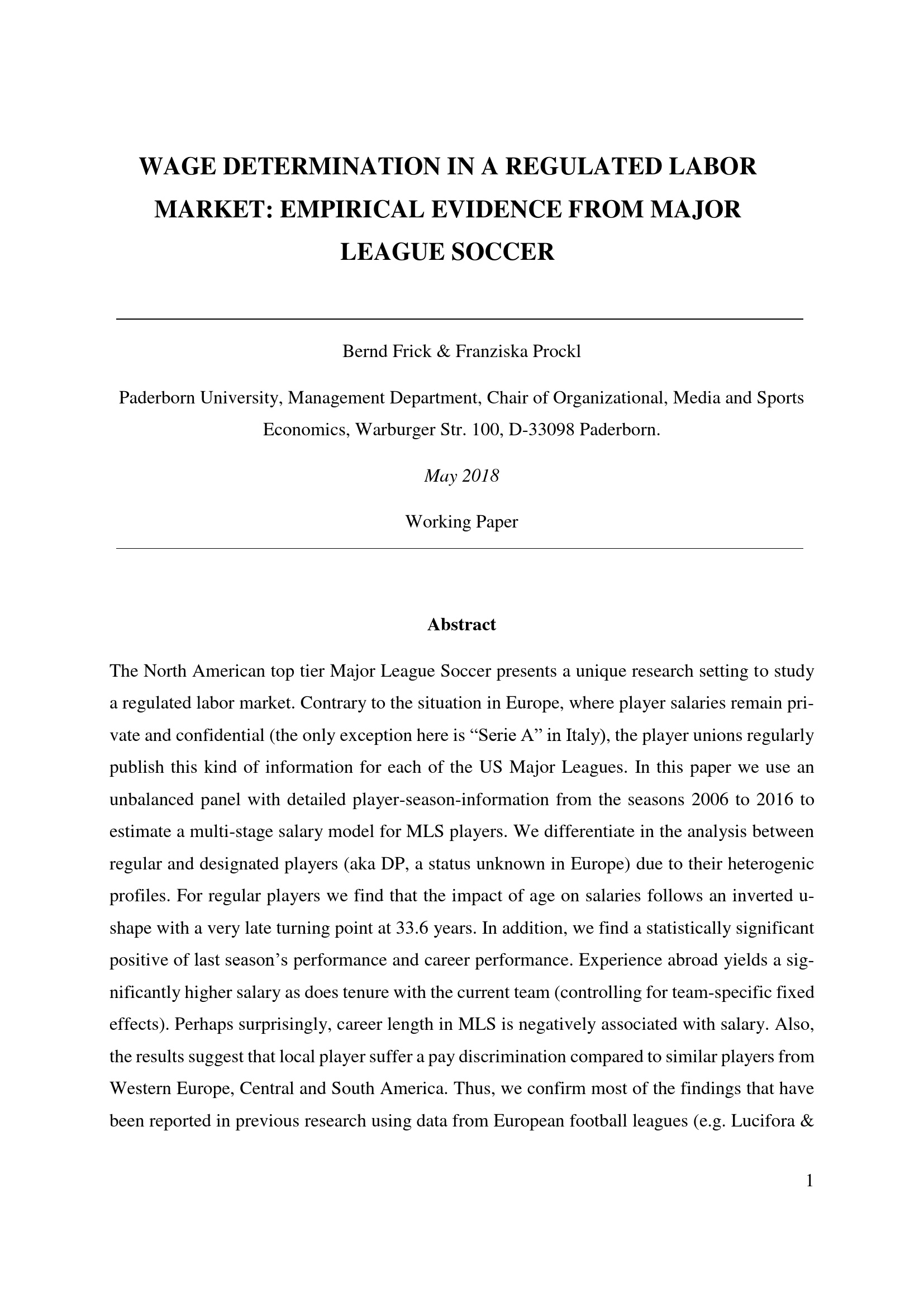 Wage determination in a regulated labor market : empirical evidence from Major League Soccer / Bernd Frick & Franziska Prockl