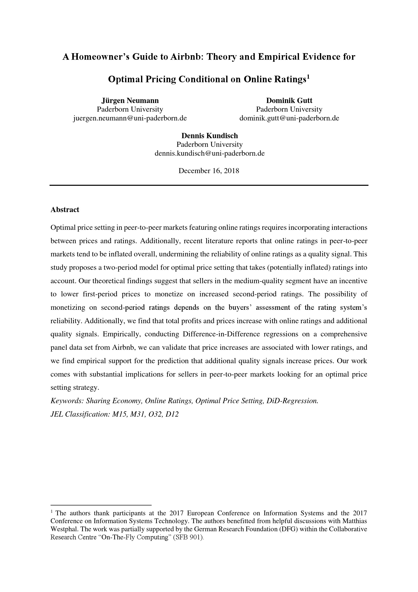 A homeowners guide to Airbnb : theory and empirical evidence for optimal pricing conditional on online ratings / Jürgen Neumann, Dominik Gutt, Dennis Kundisch