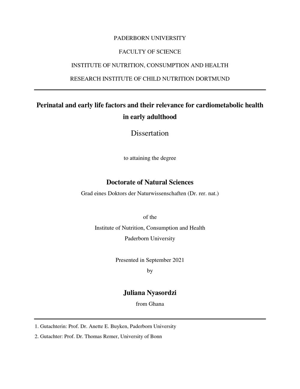 Perinatal and early life factors and their relevance for cardiometabolic health in early adulthood / by Juliana Nyasordzi ; 1. Gutachterin: Prof. Dr. Anette E. Buyken, Paderborn University, 2. Gutachter: Prof. Dr. Thomas Remer, University of Bonn