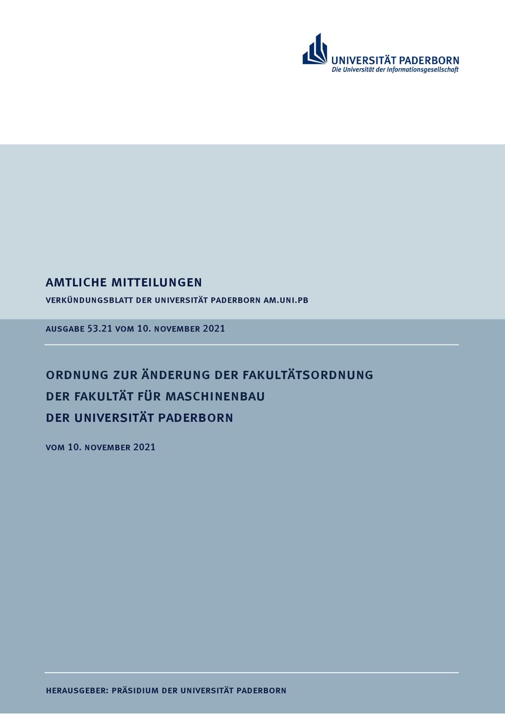 Ordnung zur Änderung der Fakultätsordnung der Fakultät für Maschinenbau der Universität Paderborn : vom 10. November 2021