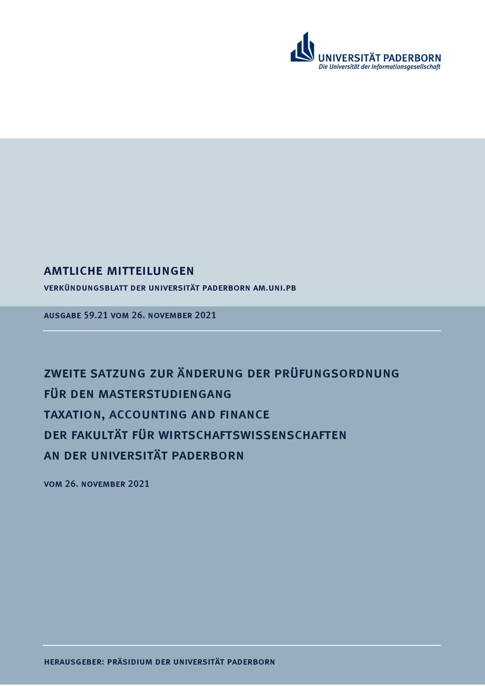 Zweite Satzung zur Änderung der Prüfungsordnung für den Masterstudiengang Taxation, Accounting and Finance der Fakultät für Wirtschaftswissenschaften an der Universität Paderborn : vom 26. November 2021