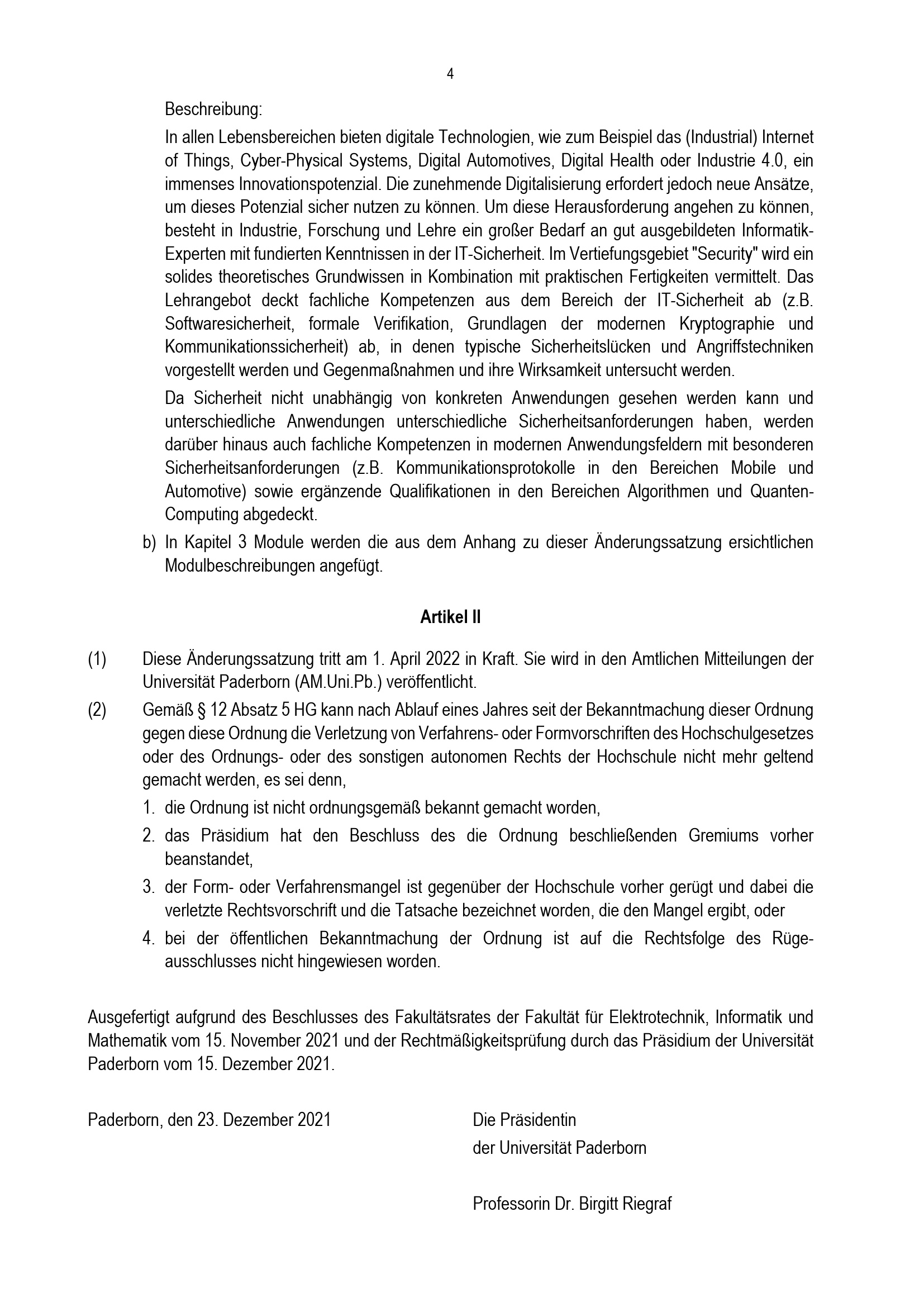 Zweite Satzung zur Änderung der Prüfungsordnung für den Masterstudiengang Informatik der Fakultät für Elektrotechnik, Informatik und Mathematik an der Universität Paderborn : vom 23. Dezember 2021