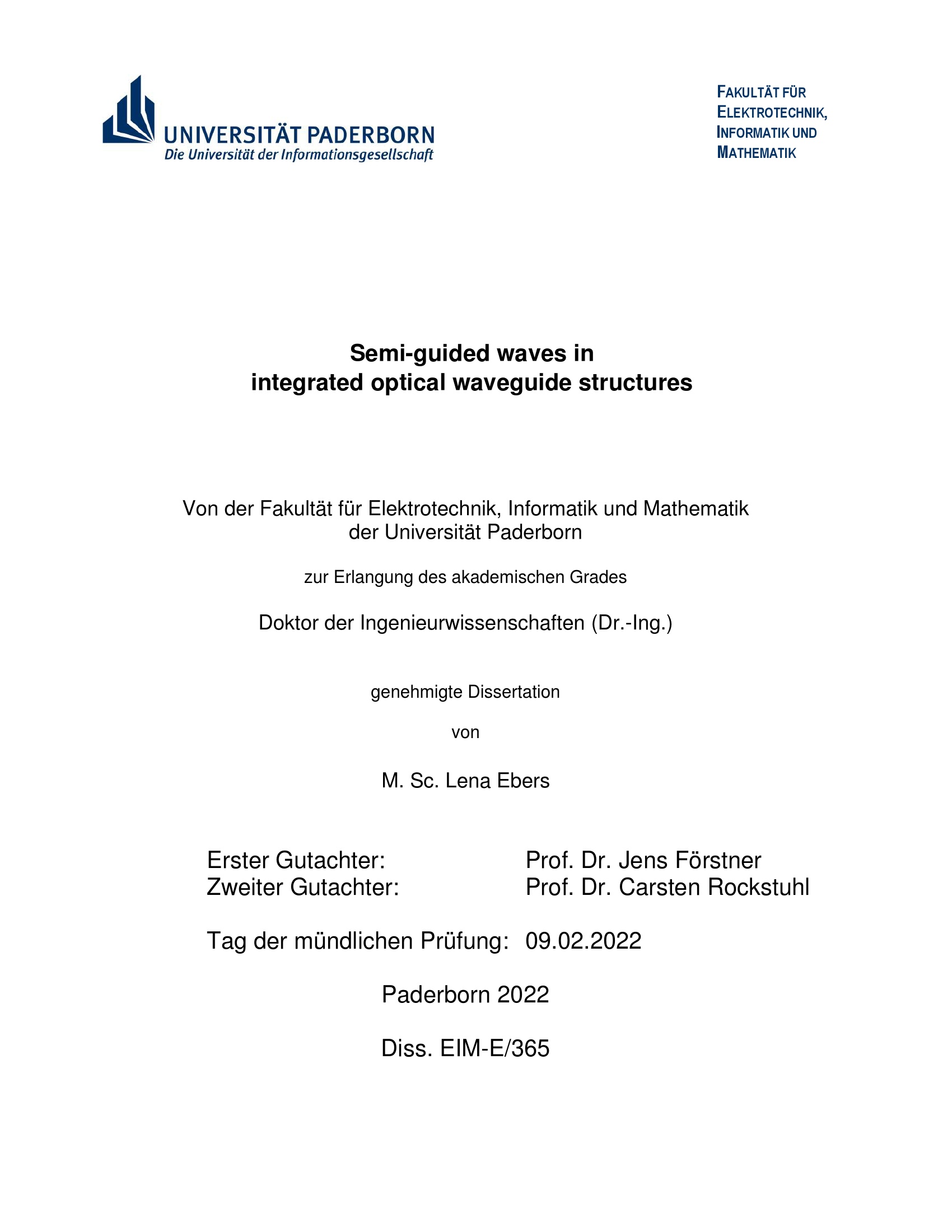 Semi-guided waves in integrated optical waveguide structures / von M. Sc. Lena Ebers ; Erster Gutachter: Prof. Dr. Jens Förstner, Zweiter Gutachter: Prof. Dr. Carsten Rockstuhl