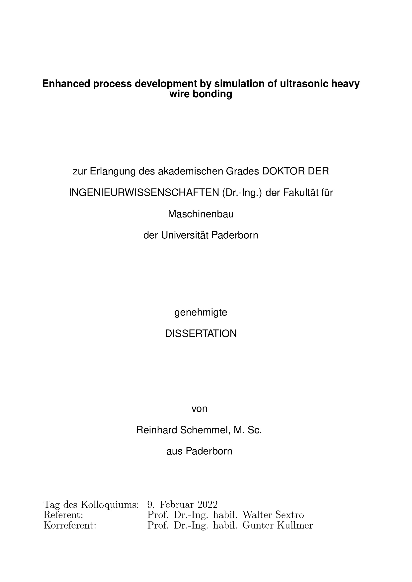 Enhanced process development by simulation of ultrasonic heavy wire bonding / von Reinhard Schemmel, M. Sc. ; Referent: Prof. Dr.-Ing. habil. Walter Sextro, Korreferent: Prof. Dr.-Ing. habil. Gunter Kullmer