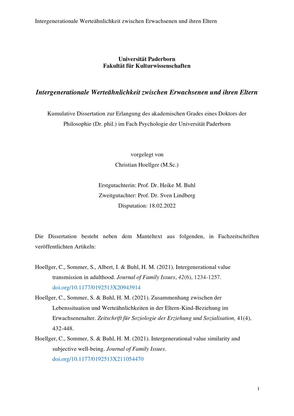 Intergenerationale Werteähnlichkeit zwischen Erwachsenen und ihren Eltern / vorgelegt von Christian Hoellger (M.Sc.) ; Erstgutachterin: Prof. Dr. Heike M. Buhl, Zweitgutachter: Prof. Dr. Sven Lindberg