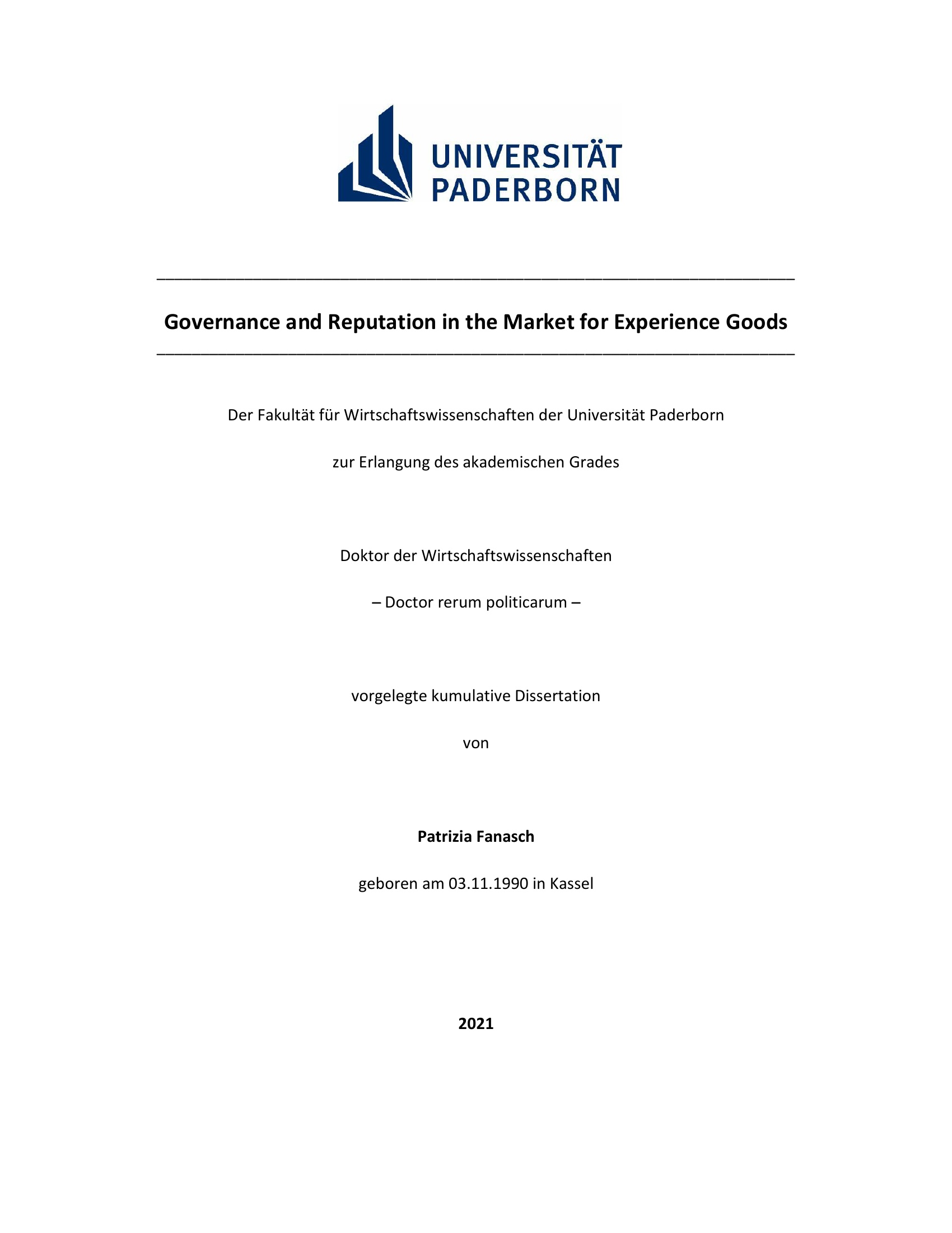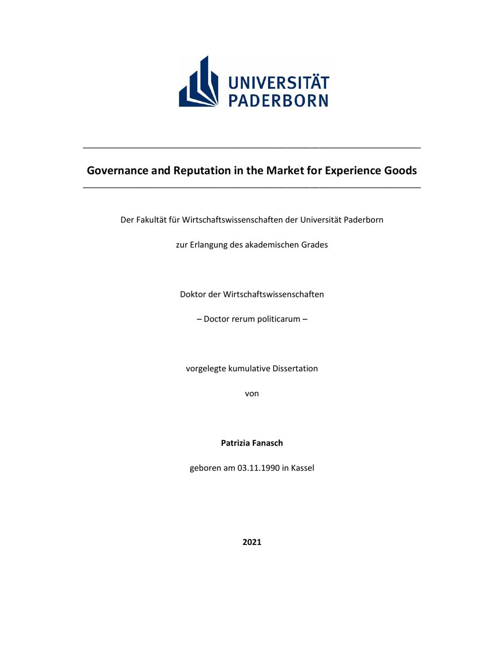 Governance and reputation in the market for experience goods / vorgelegte kumulative Dissertation von Patrizia Fanasch ; [First supervisor Prof. Dr. Bernd Frick (Faculty of Business Administration and Economics, Paderborn University), Second supervisor Clinical Prof. Dr. Karl Storchmann (Economics Department, New York University)]