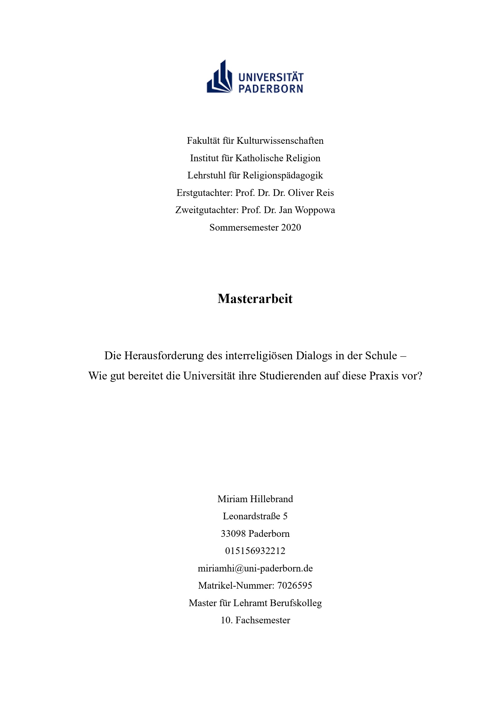 Die Herausforderung des interreligiösen Dialogs in der Schule - : wie gut bereitet die Universität ihre Studierenden auf diese Praxis vor? / Miriam Hillebrand ; Erstgutachter: Prof. Dr. Dr. Oliver Reis, Zweitgutachter: Prof. Dr. Jan Woppowa