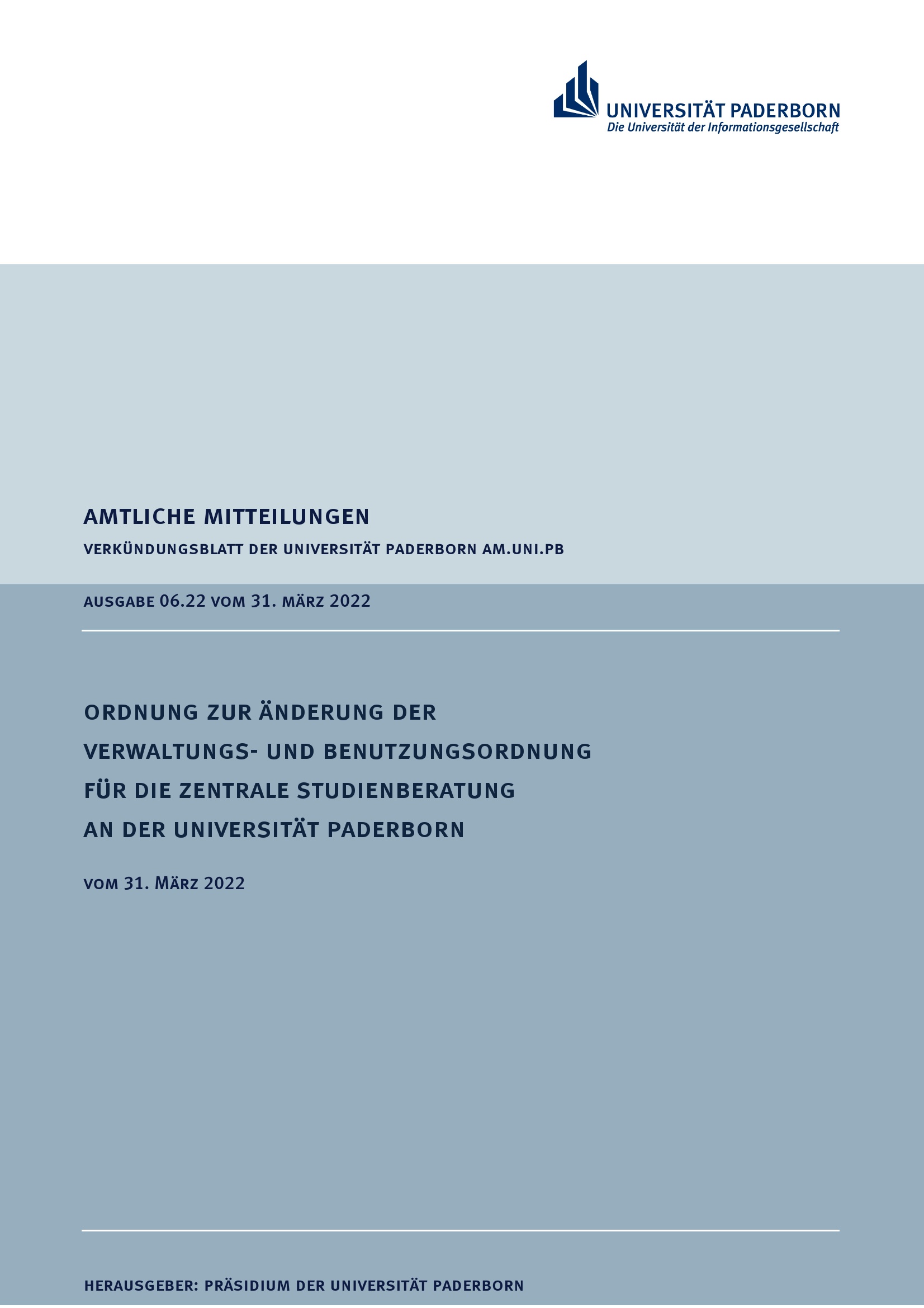 Ordnung zur Änderung der Verwaltungs- und Benutzungsordnung für die Zentrale Studienberatung der Universität Paderborn : vom 31. März 2022