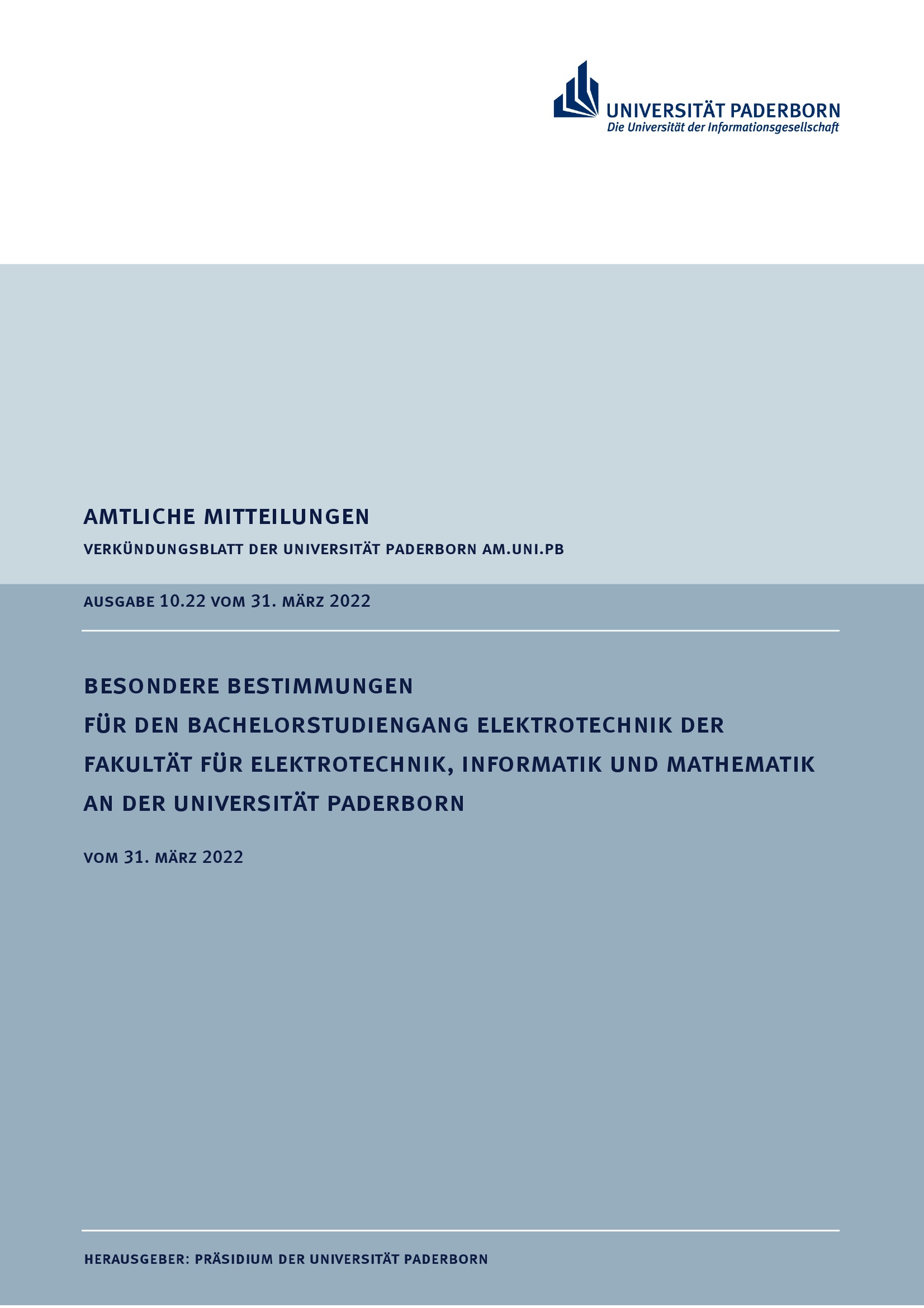 Besondere Bestimmungen der Prüfungsordnung für den Bachelorstudiengang Elektrotechnik der Fakultät für Elektrotechnik, Informatik und Mathematik an der Universität Paderborn : vom 31. März 2022