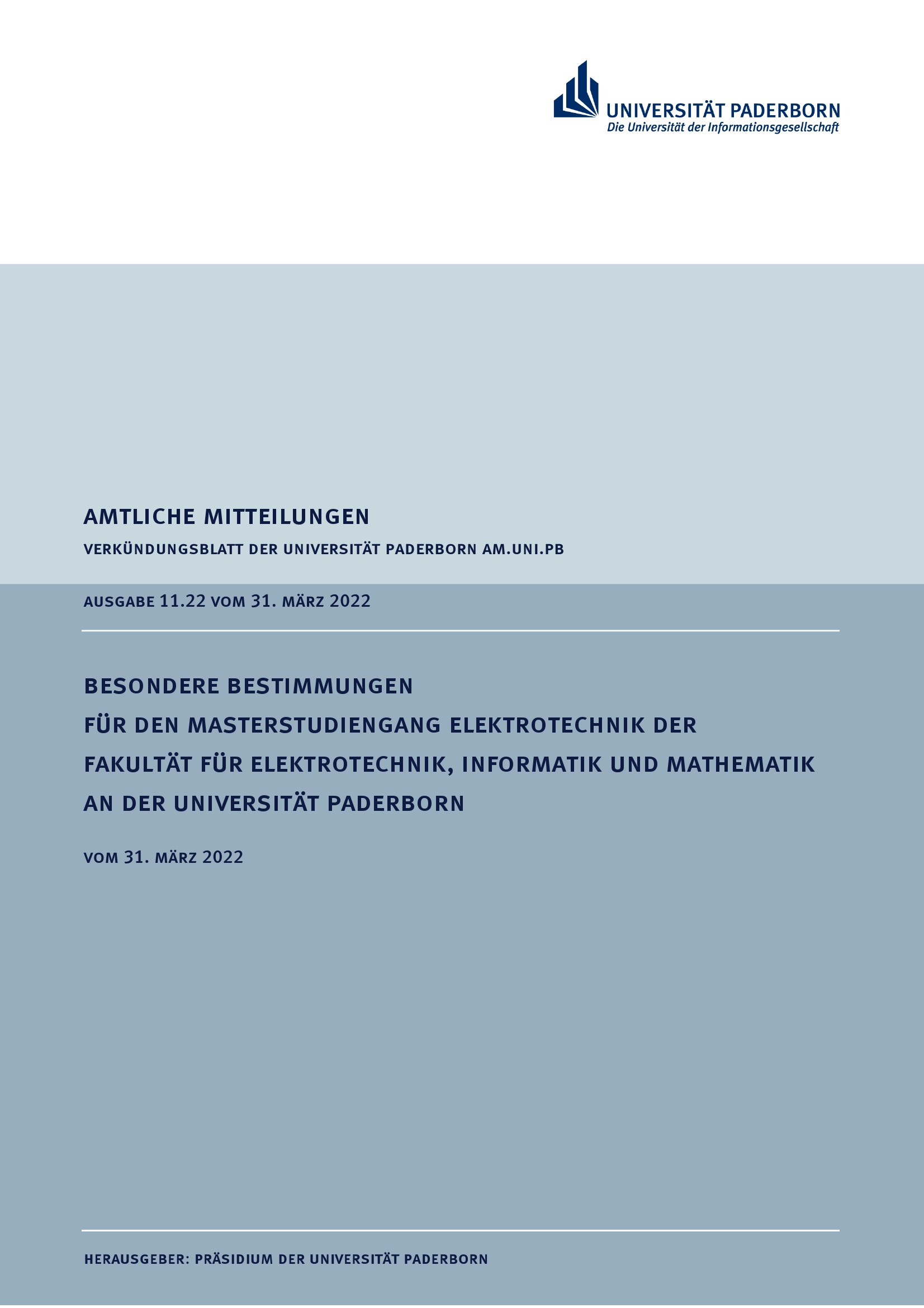 Besondere Bestimmungen der Prüfungsordnung für den Masterstudiengang Elektrotechnik der Fakultät für Elektrotechnik, Informatik und Mathematik an der Universität Paderborn : vom 31. März 2022