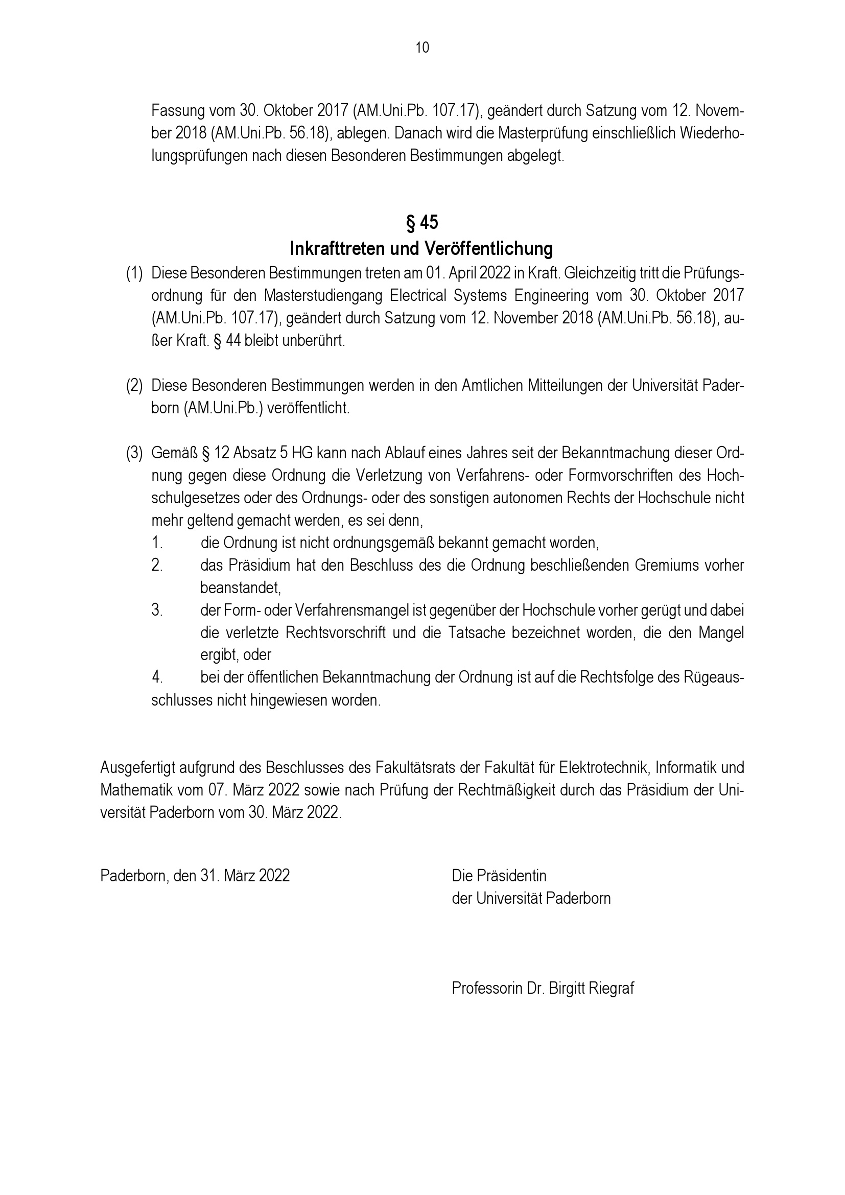 Besondere Bestimmungen der Prüfungsordnung für den Masterstudiengang Electrical Systems Engineering an der Universität Paderborn : vom 31. März 2022