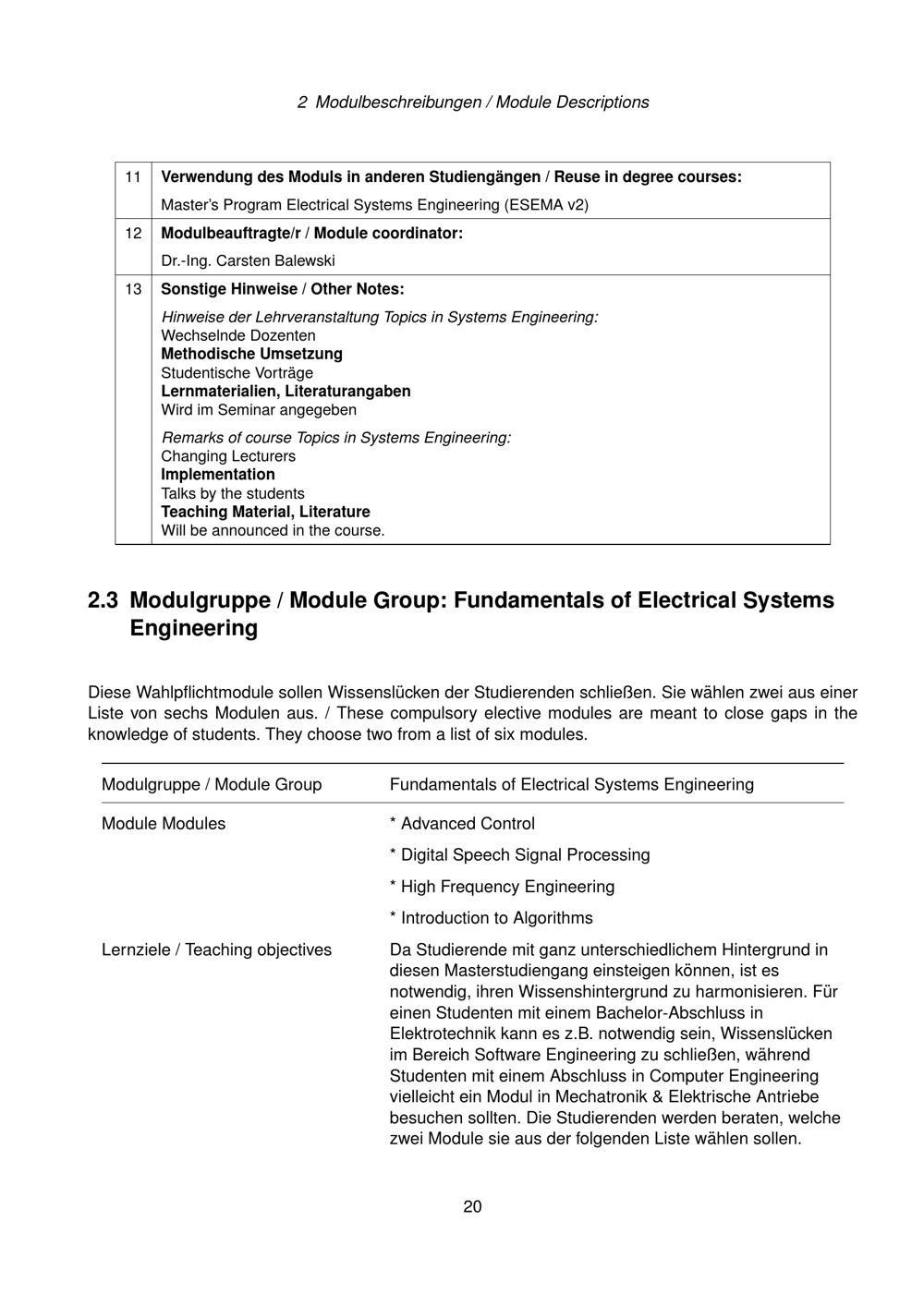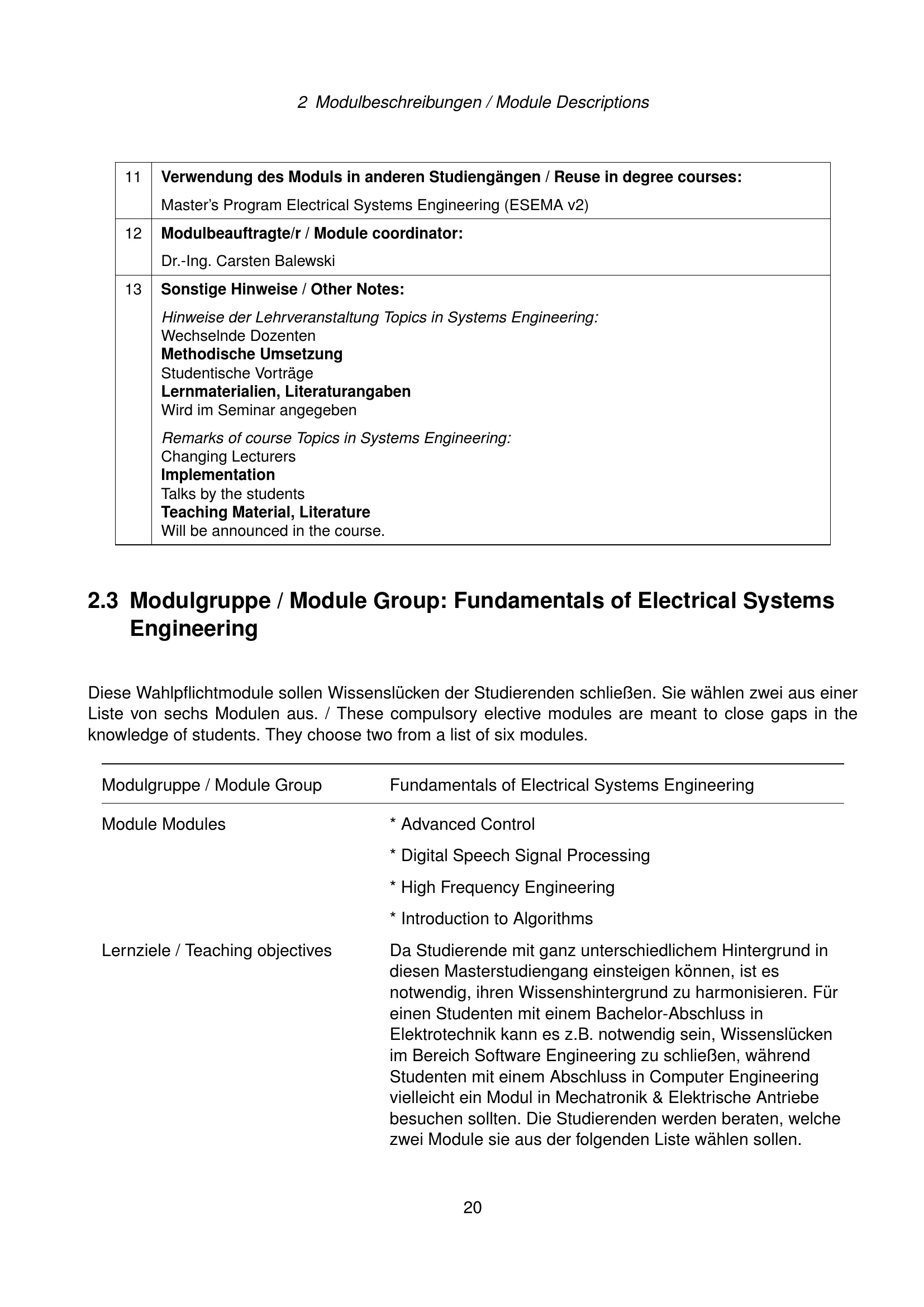 Modulgruppe / Module Group: Fundamentals of Electrical Systems Engineering