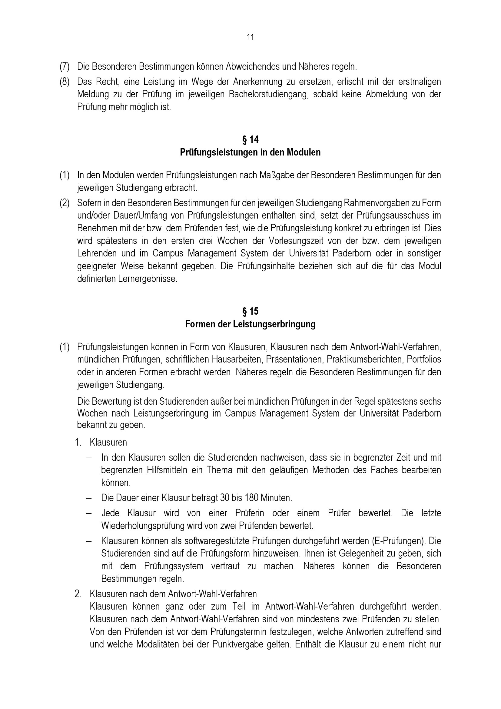 Allgemeine Bestimmungen der Prüfungsordnungen für die Bachelorstudiengänge der Fakultät für Wirtschaftswissenschaften an der Universität Paderborn : vom 22. April 2022