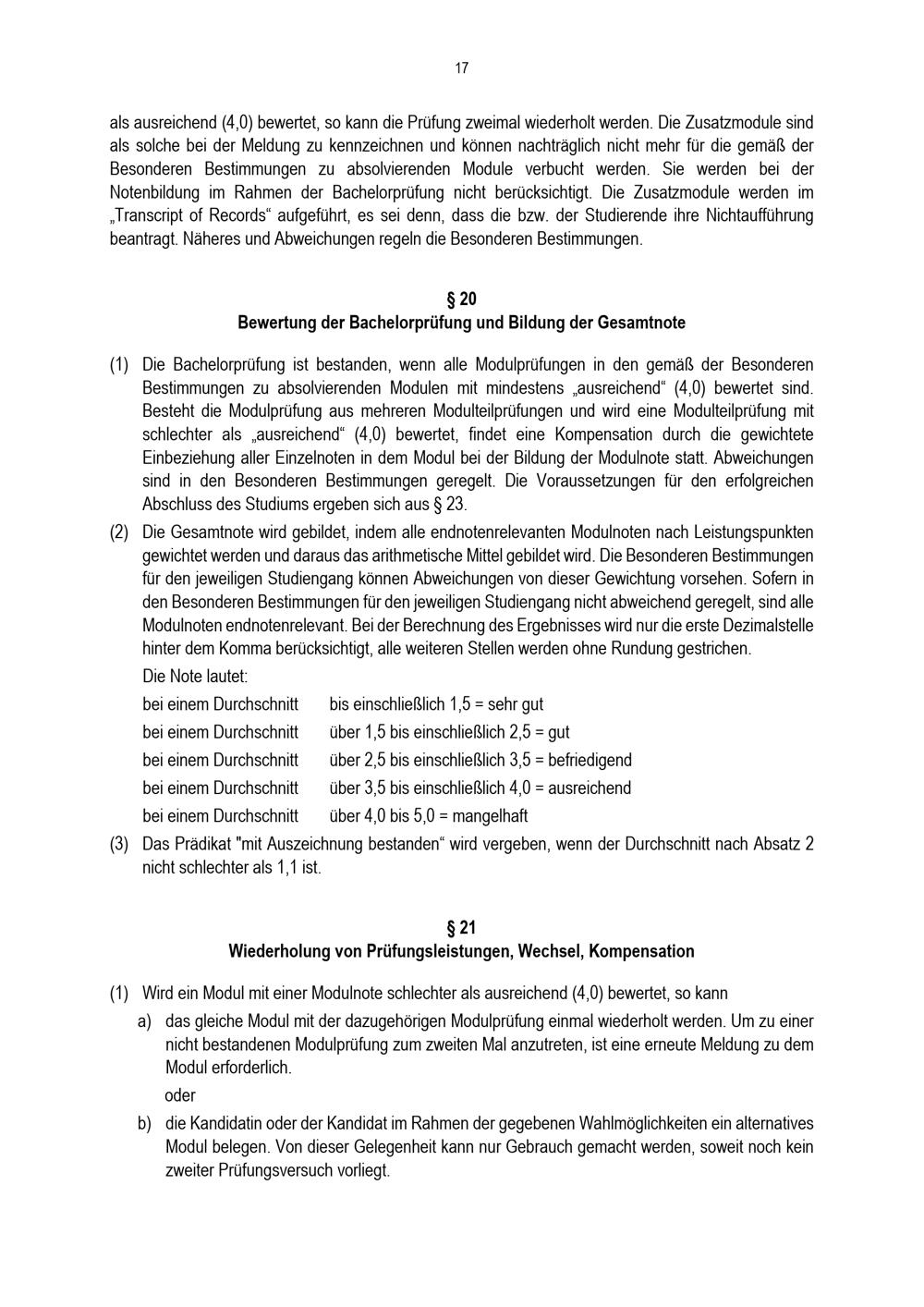 § 20 Bewertung der Bachelorprüfung und Bildung der Gesamtnote