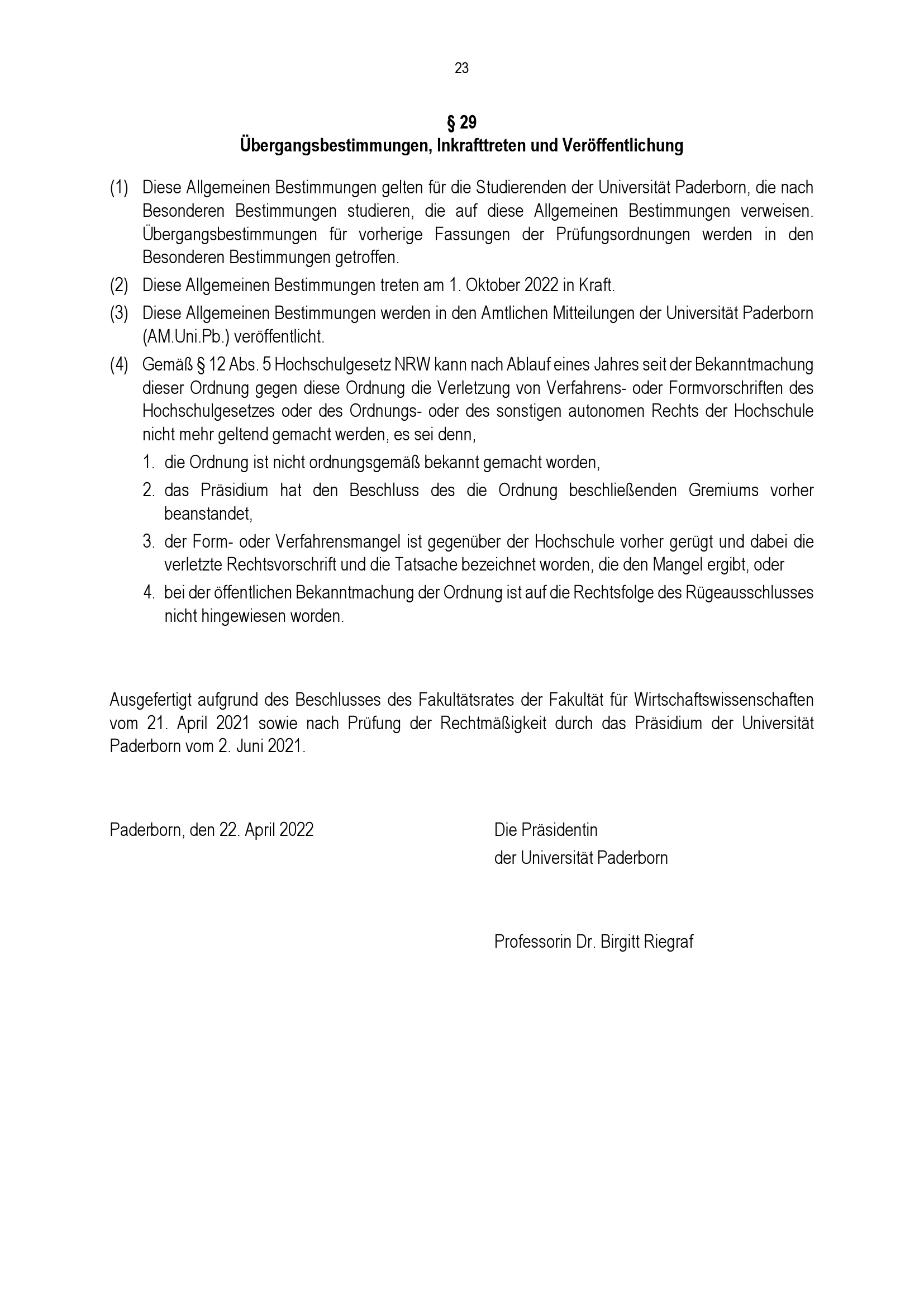 Allgemeine Bestimmungen der Prüfungsordnungen für die Bachelorstudiengänge der Fakultät für Wirtschaftswissenschaften an der Universität Paderborn : vom 22. April 2022