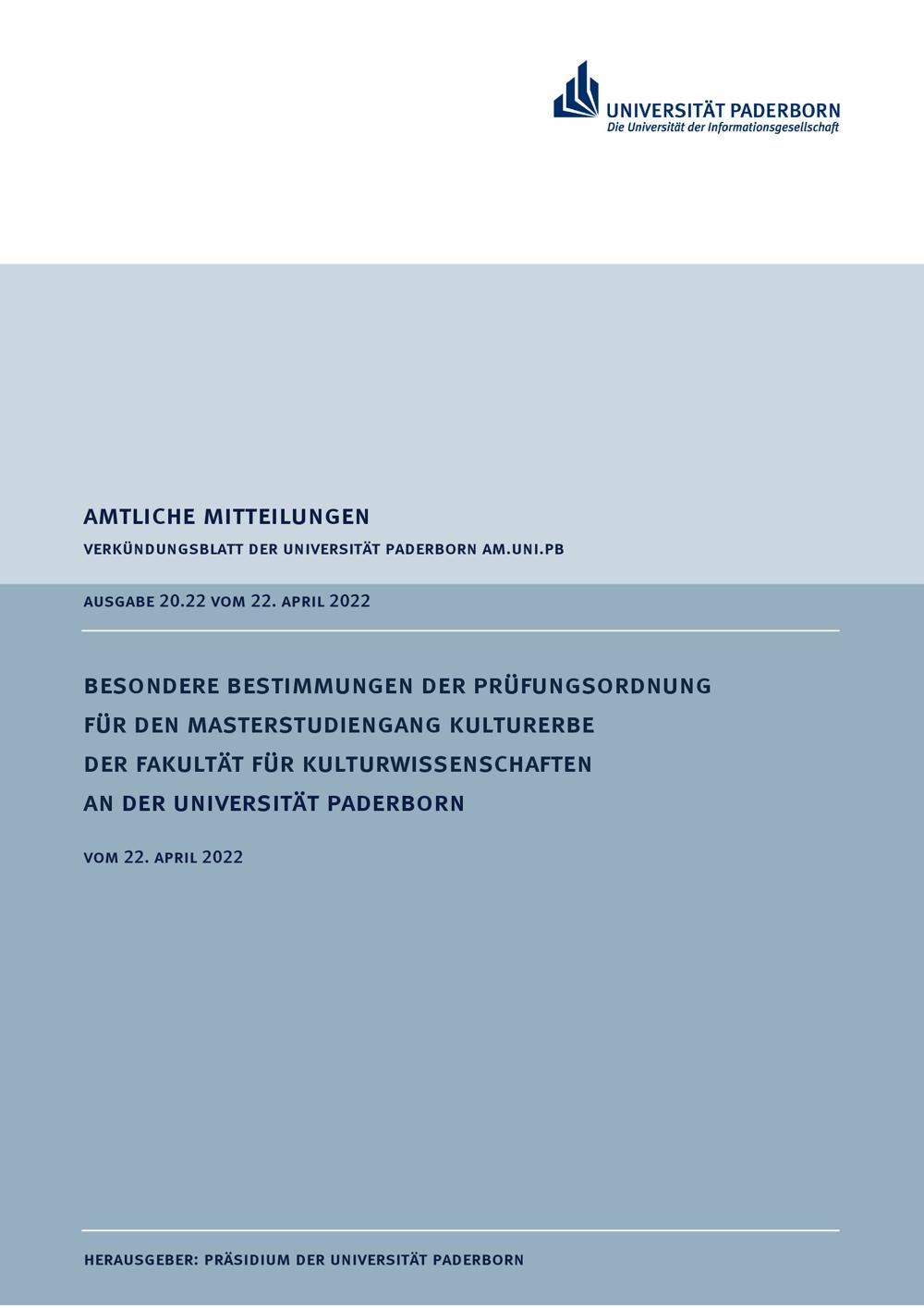 Besondere Bestimmungen der Prüfungsordnung für den Masterstudiengang Kulturerbe der Fakultät für Kulturwissenschaften an der Universität Paderborn : vom 22. April 2022
