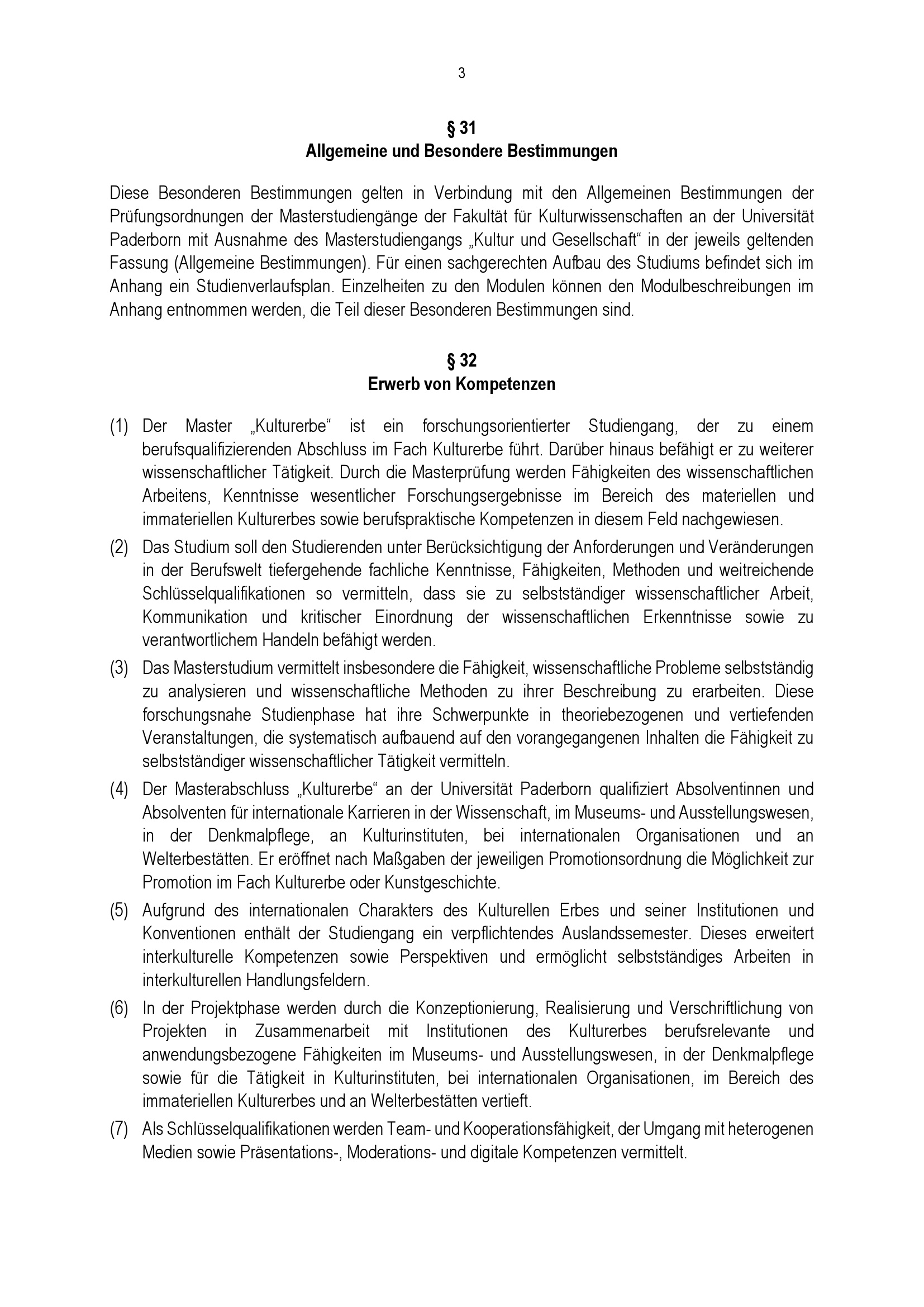 Besondere Bestimmungen der Prüfungsordnung für den Masterstudiengang Kulturerbe der Fakultät für Kulturwissenschaften an der Universität Paderborn : vom 22. April 2022
