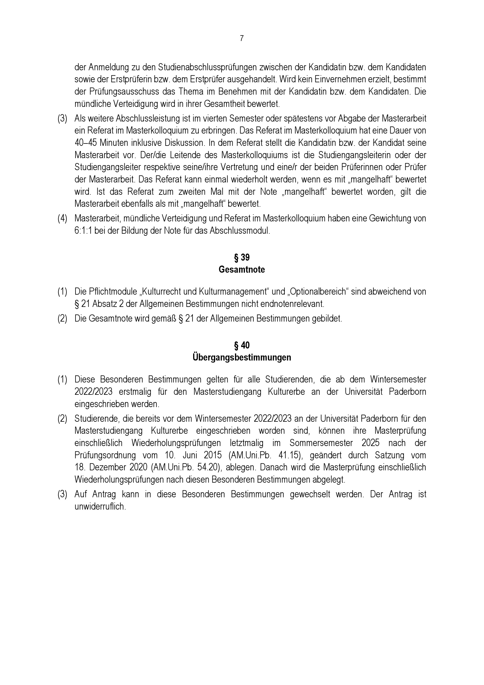 Besondere Bestimmungen der Prüfungsordnung für den Masterstudiengang Kulturerbe der Fakultät für Kulturwissenschaften an der Universität Paderborn : vom 22. April 2022