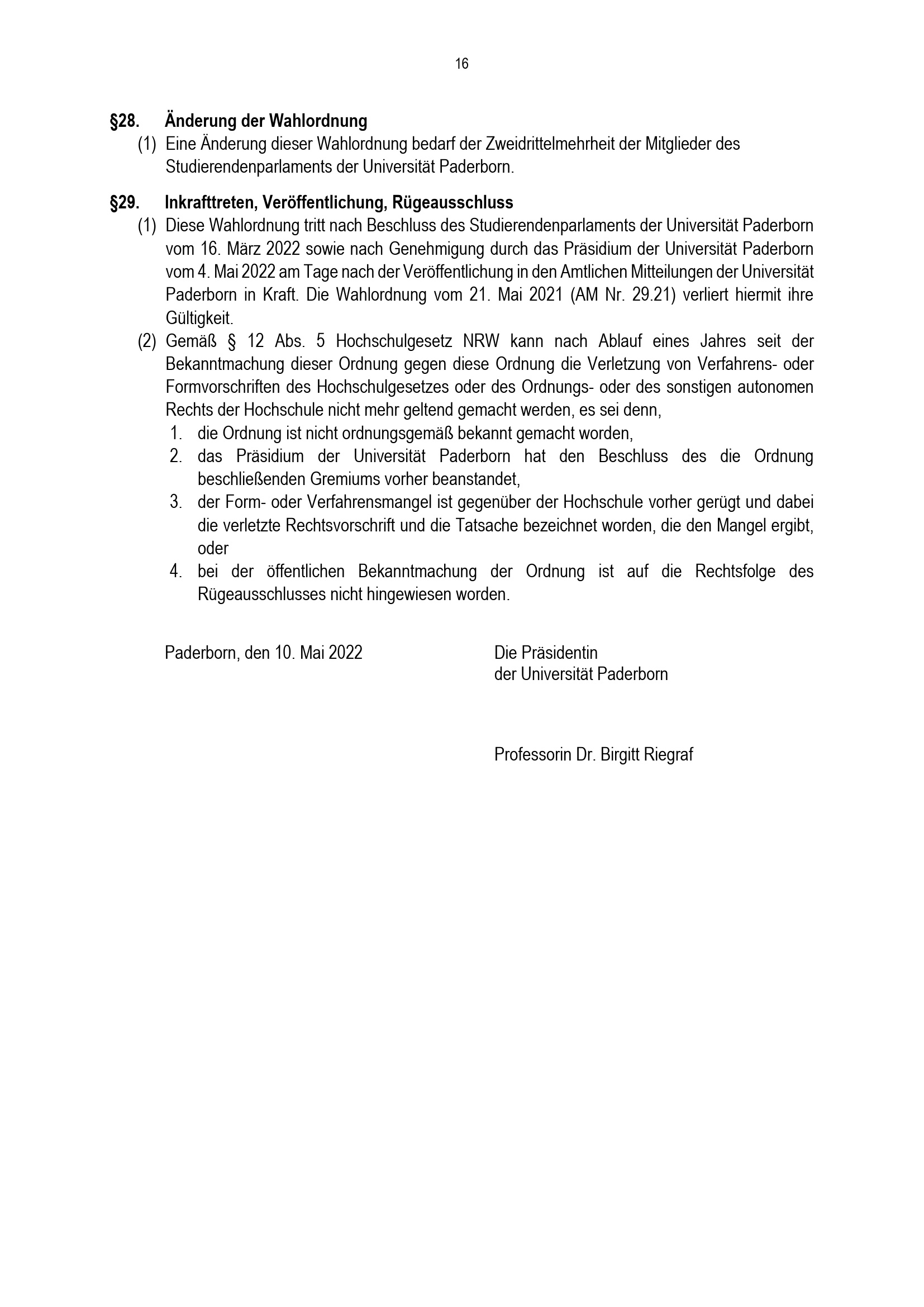 Wahlordnung für die Wahlen zum Studierendenparlament und zu den direkt zu wählenden Fachschaftsorganen der Studierendenschaft an der Universität Paderborn : vom 10. Mai 2022
