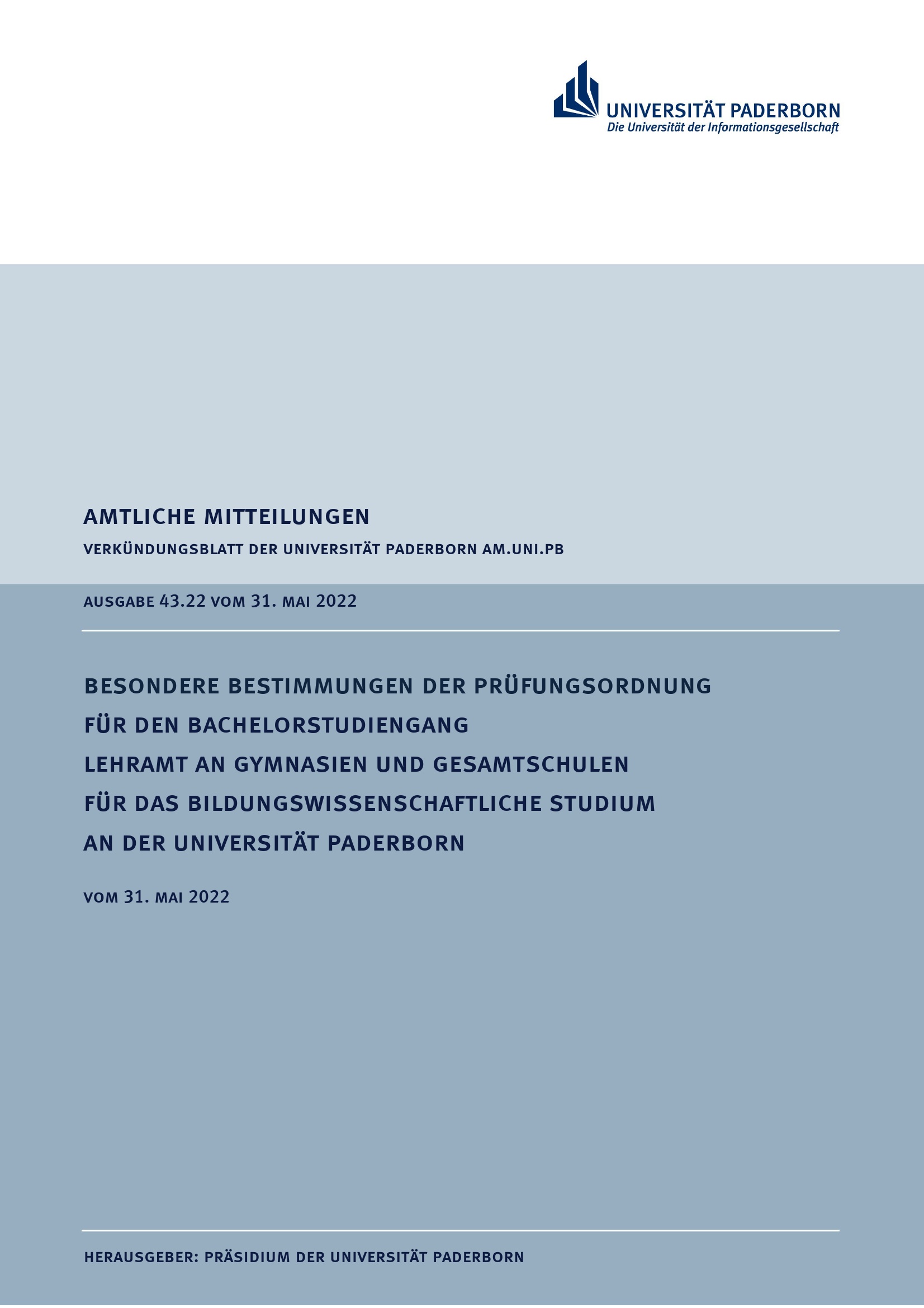Besondere Bestimmungen der Prüfungsordnung für den Bachelorstudiengang Lehramt an Gymnasien und Gesamtschulen für das bildungswissenschaftliche Studium an der Universität Paderborn : vom 31. Mai 2022