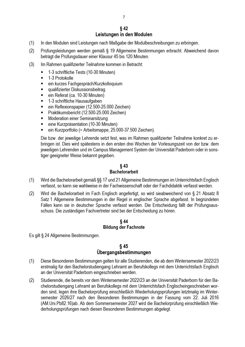 Besondere Bestimmungen der Prüfungsordnung für den Bachelorstudiengang Lehramt an Berufskollegs mit dem Unterrichtsfach Englisch an der Universität Paderborn : vom 31. Mai 2022