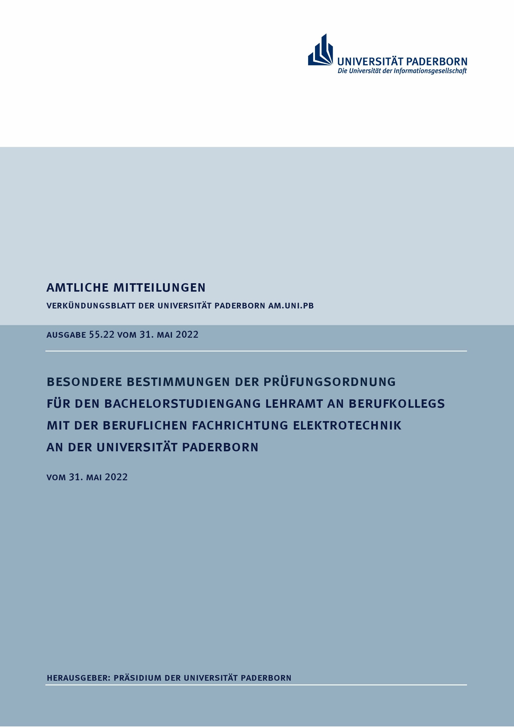 Besondere Bestimmungen der Prüfungsordnung für den Bachelorstudiengang Lehramt an Berufskollegs mit der beruflichen Fachrichtung Elektrotechnik an der Universität Paderborn : vom 31. Mai 2022