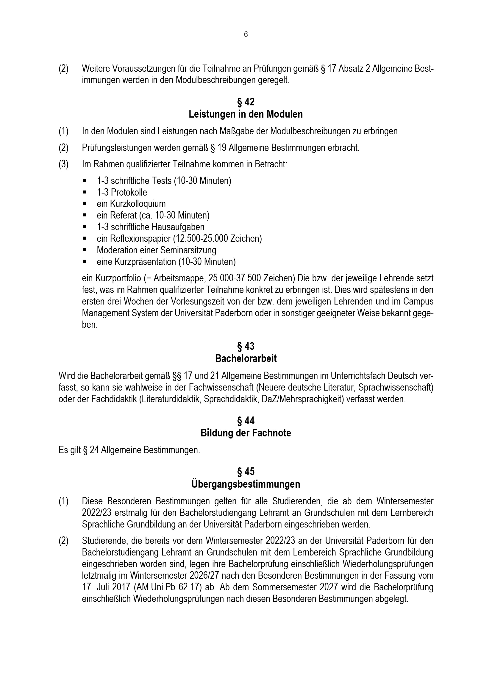 Besondere Bestimmungen der Prüfungsordnung für den Bachelorstudiengang Lehramt an Grundschulen mit dem Lernbereich Sprachliche Grundbildung an der Universität Paderborn : vom 31. Mai 2022