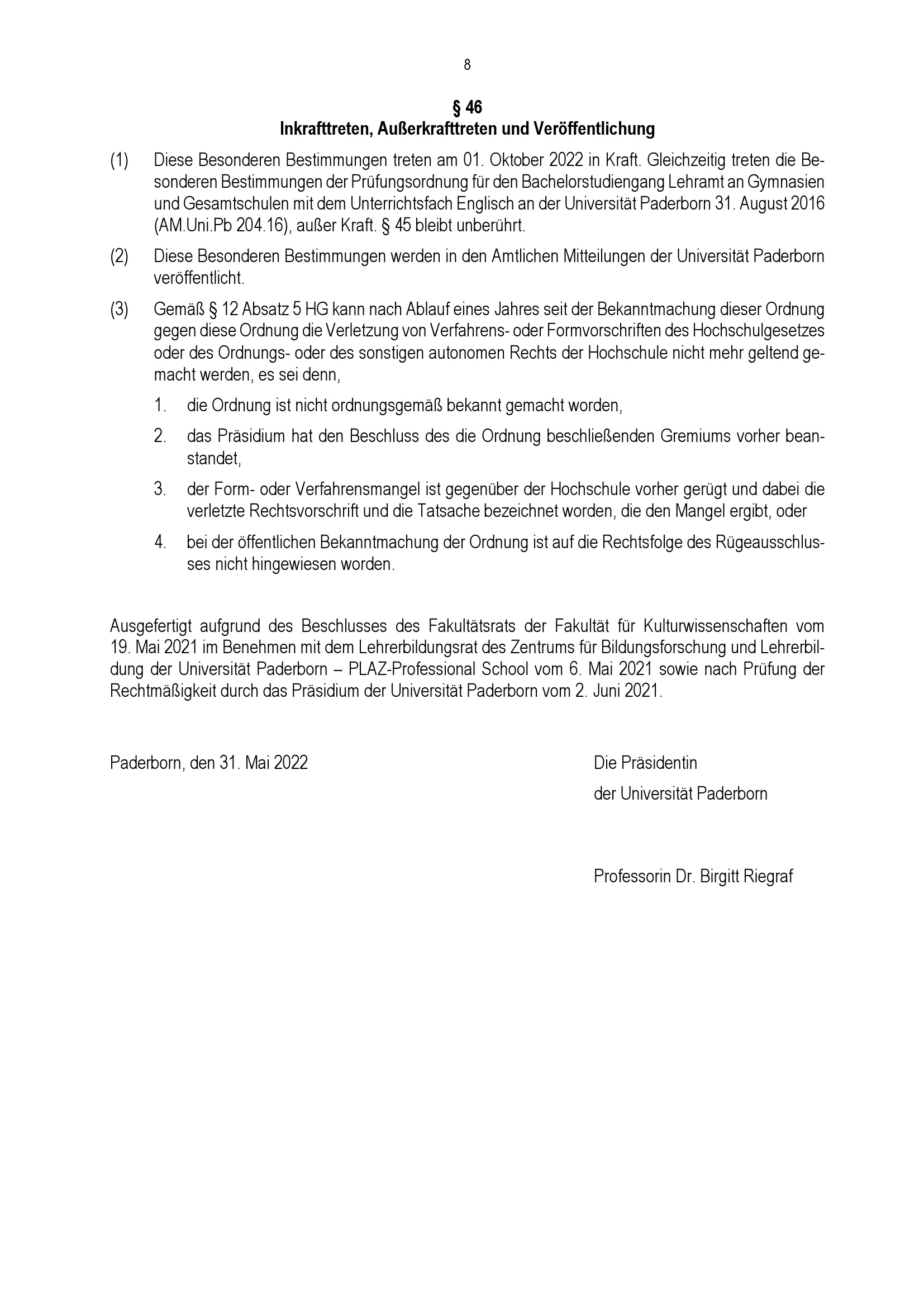 Besondere Bestimmungen der Prüfungsordnung für den Bachelorstudiengang Lehramt an Gymnasien und Gesamtschulen mit dem Unterrichtsfach Englisch an der Universität Paderborn : vom 31. Mai 2022