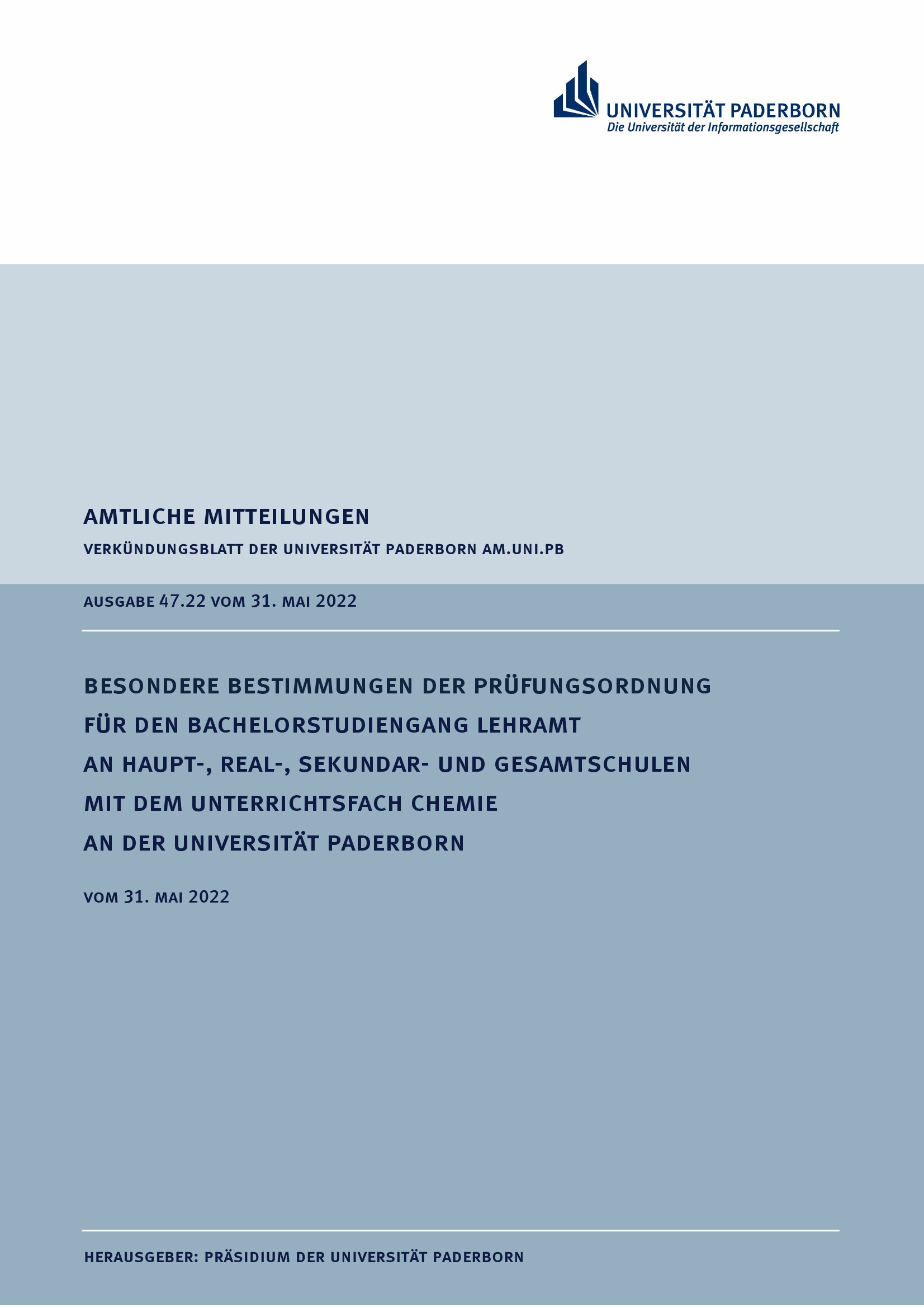 Besondere Bestimmungen der Prüfungsordnung für den Bachelorstudiengang Lehramt an Haupt-, Real-, Sekundar- und Gesamtschulen mit dem Unterrichtsfach Chemie an der Universität Paderborn : vom 31. Mai 2022