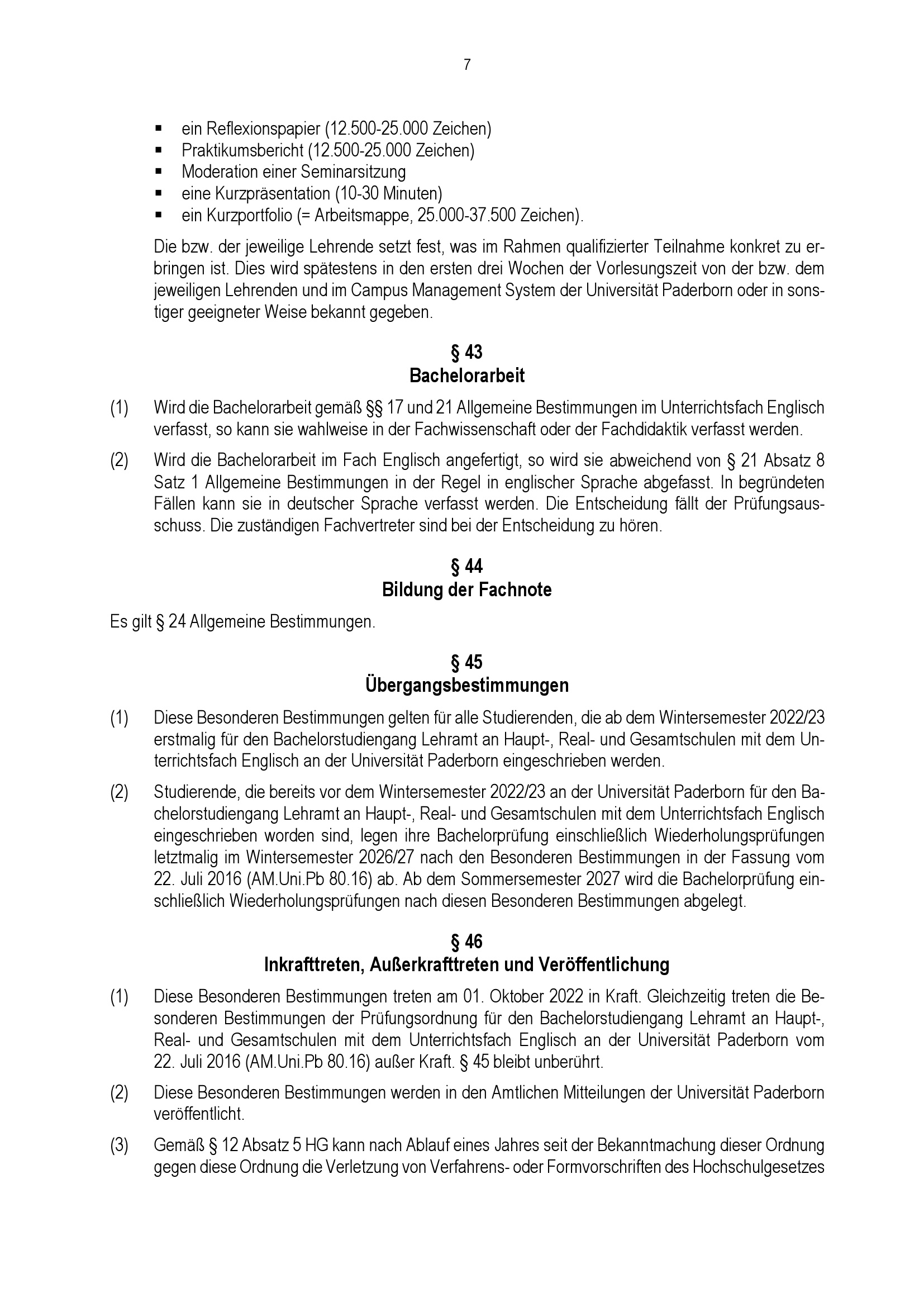 Besondere Bestimmungen der Prüfungsordnung für den Bachelorstudiengang Lehramt an Haupt-, Real-, Sekundar- und Gesamtschulen mit dem Unterrichtsfach Englisch an der Universität Paderborn : vom 31. Mai 2022