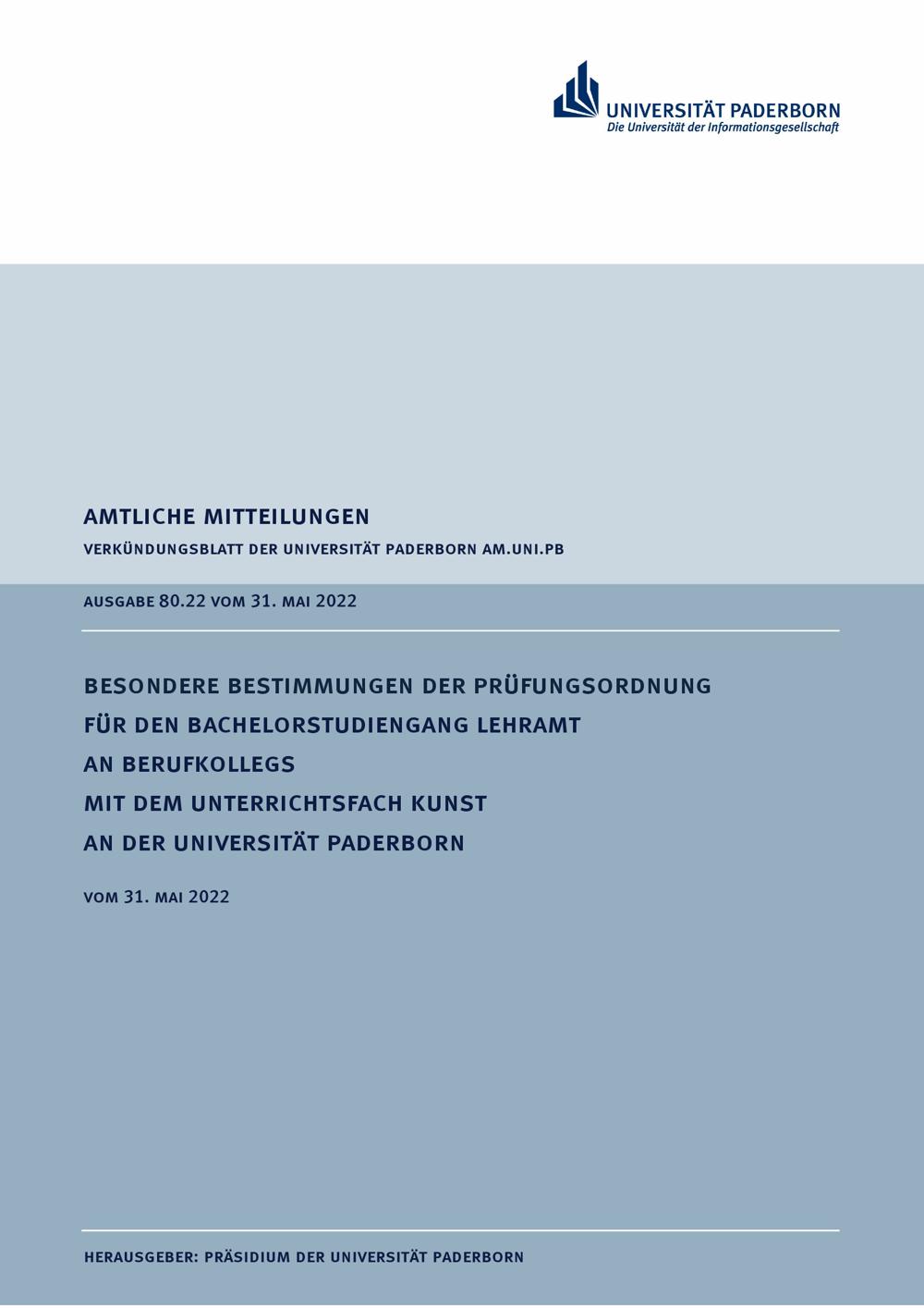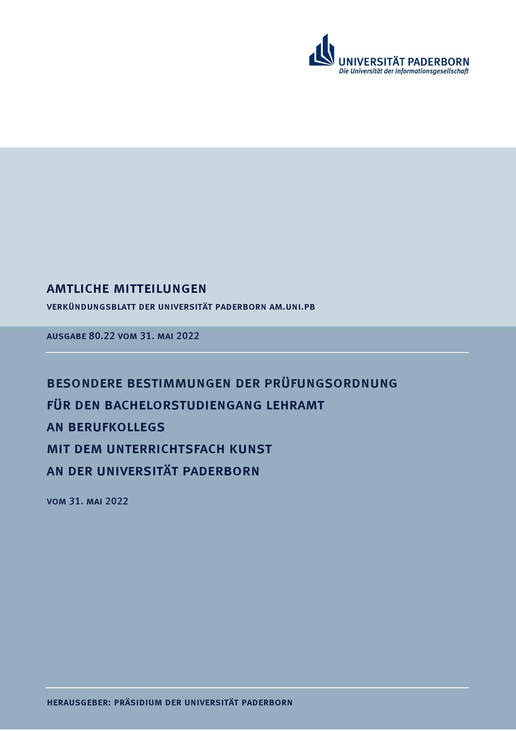 Besondere Bestimmungen der Prüfungsordnung für den Bachelorstudiengang Lehramt an Berufskollegs mit dem Unterrichtsfach Kunst an der Universität Paderborn : vom 31. Mai 2022