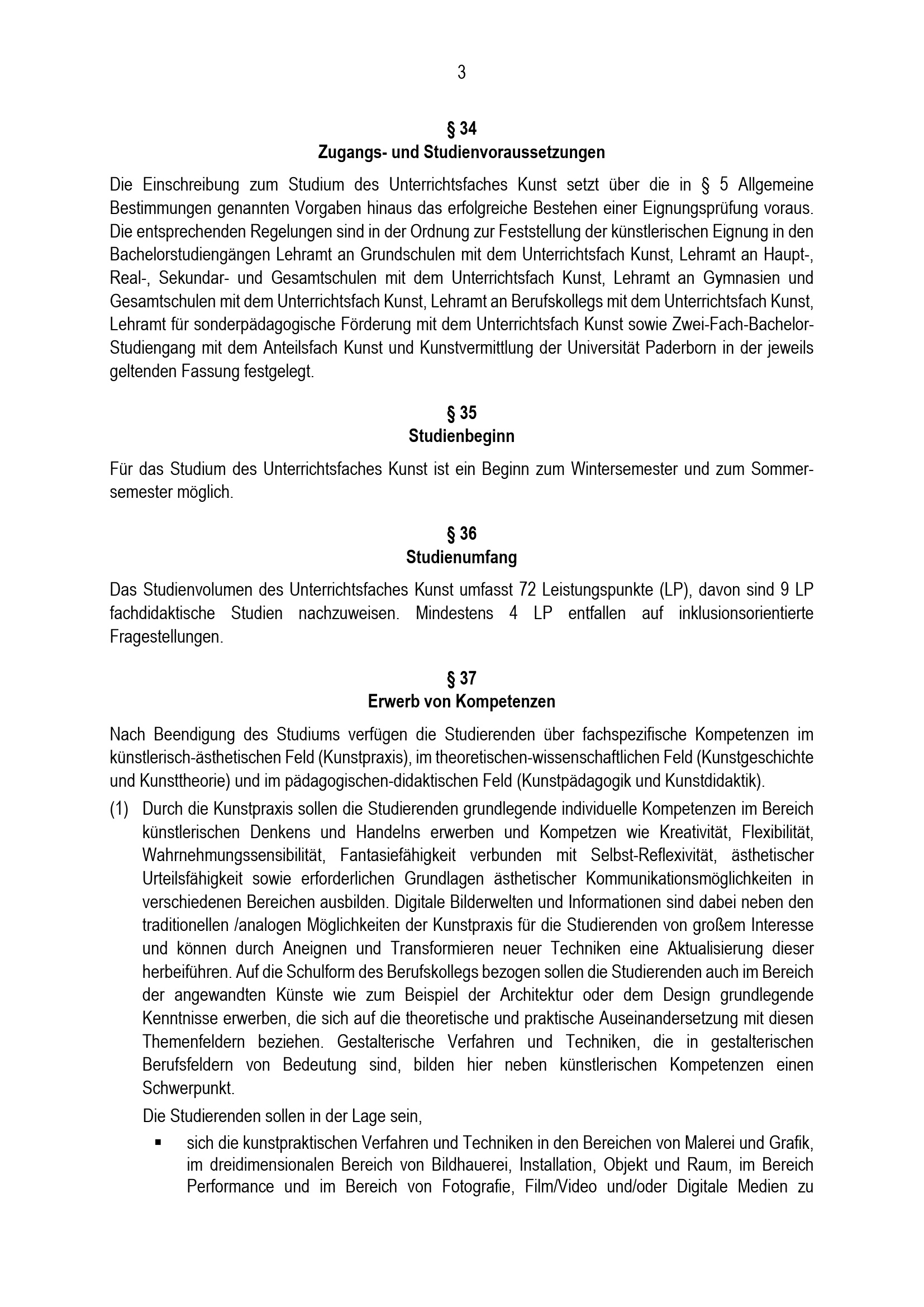 Besondere Bestimmungen der Prüfungsordnung für den Bachelorstudiengang Lehramt an Berufskollegs mit dem Unterrichtsfach Kunst an der Universität Paderborn : vom 31. Mai 2022