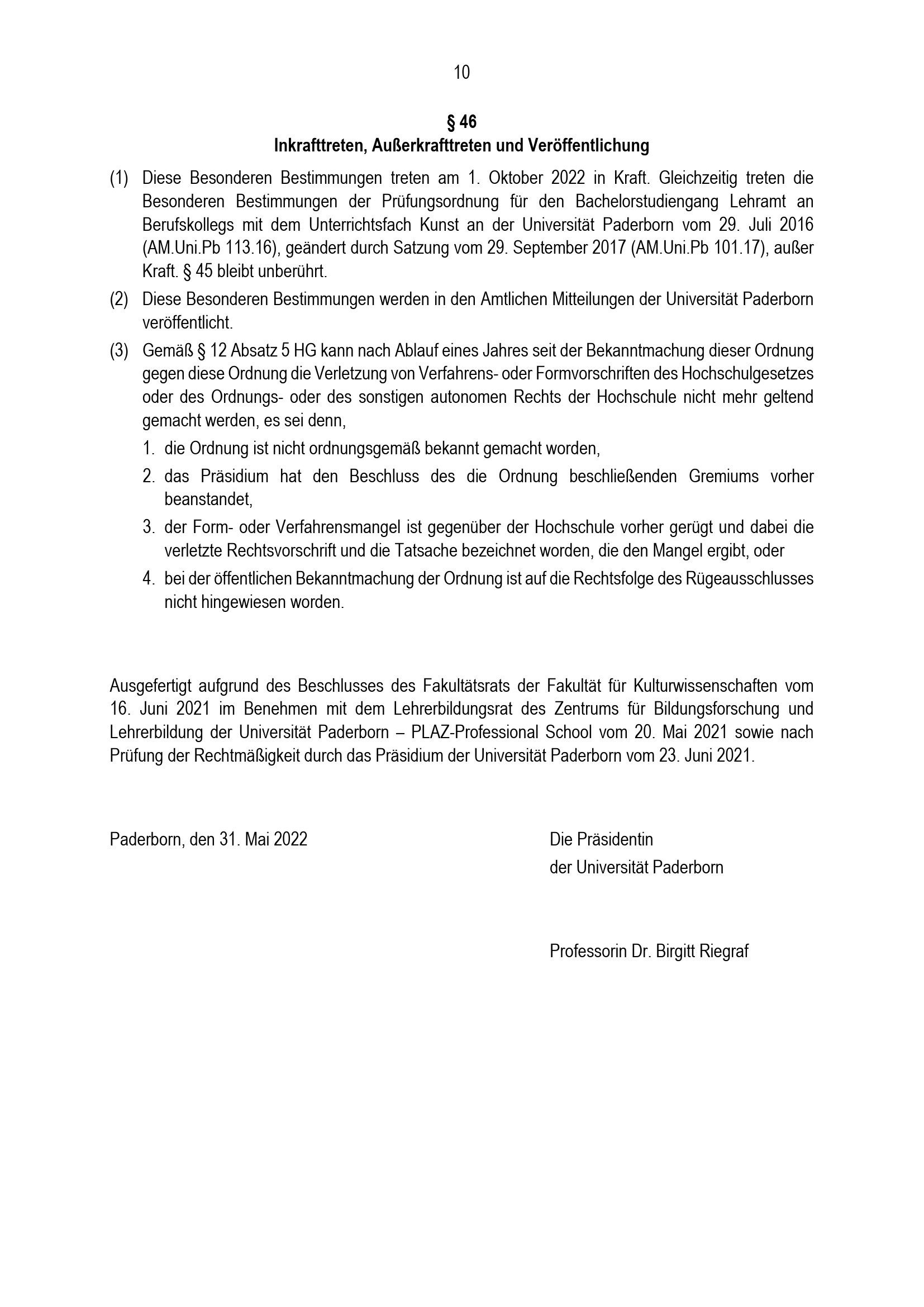 Besondere Bestimmungen der Prüfungsordnung für den Bachelorstudiengang Lehramt an Berufskollegs mit dem Unterrichtsfach Kunst an der Universität Paderborn : vom 31. Mai 2022