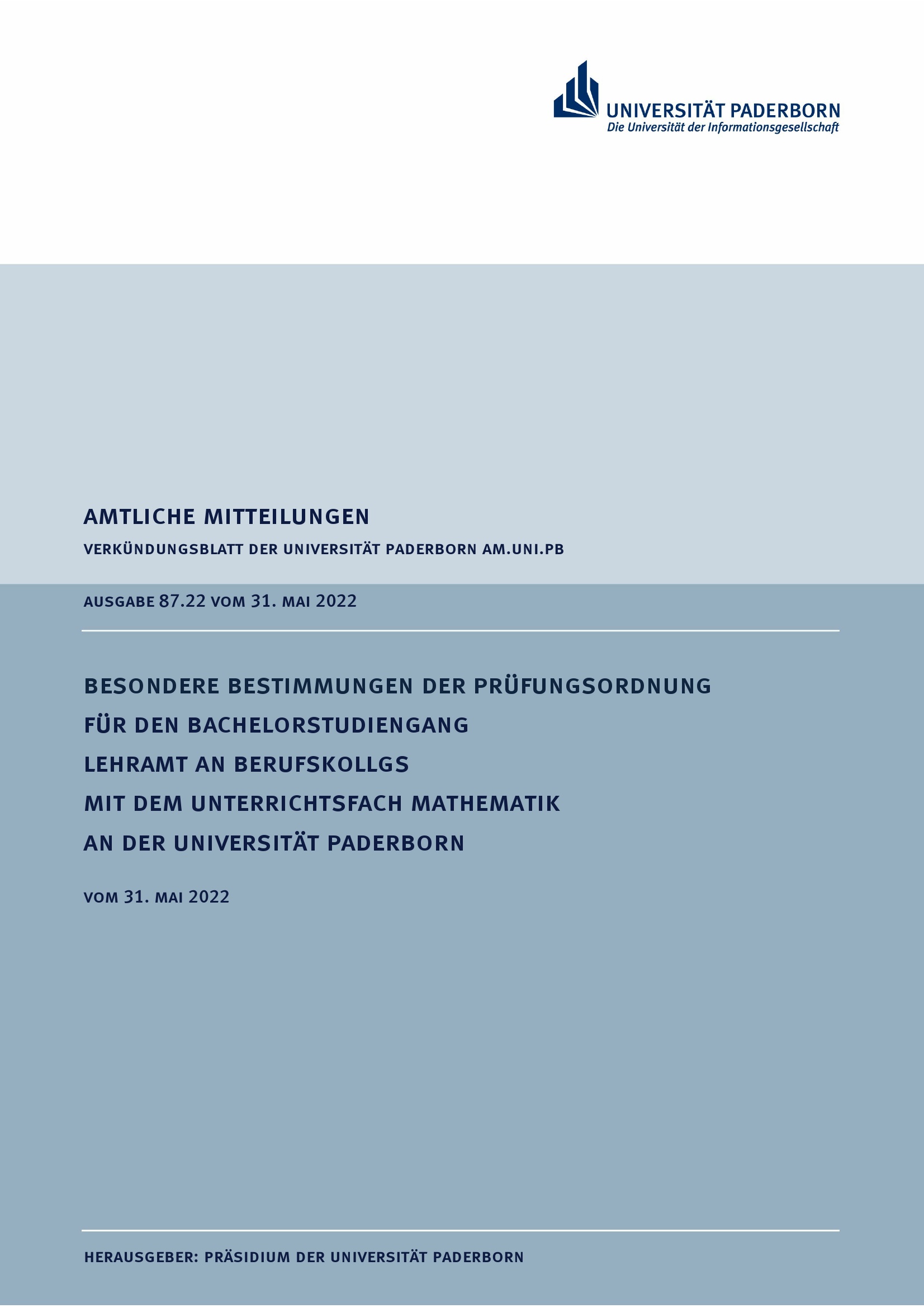 Besondere Bestimmungen der Prüfungsordnung für den Bachelorstudiengang Lehramt an Berufskollegs mit dem Unterrichtsfach Mathematik an der Universität Paderborn : vom 31. Mai 2022