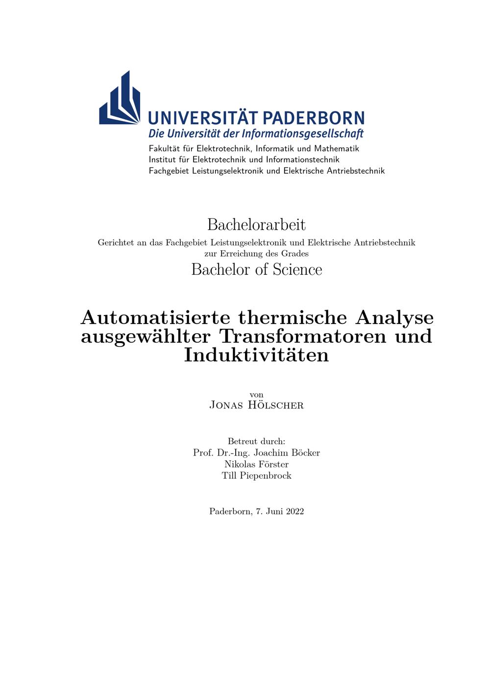 Automatisierte thermische Analyse ausgewählter Transformatoren und Induktivitäten / von Jonas Hölscher ; betreut durch: Prof. Dr.-Ing. Joachim Böcker, Nikolas Förster, Till Piepenbrock