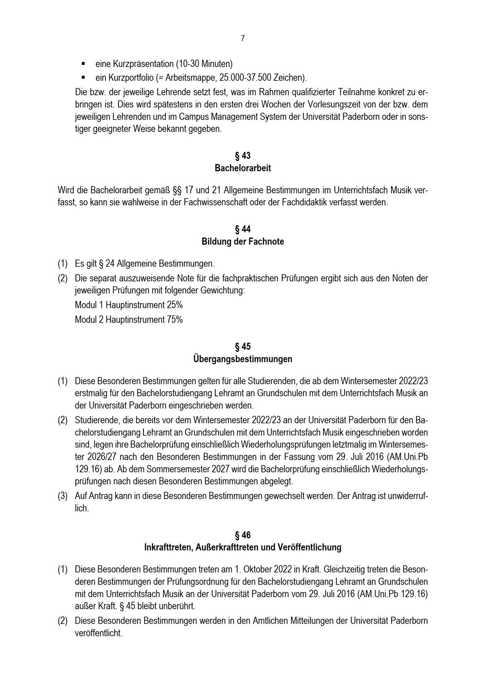 Besondere Bestimmungen der Prüfungsordnung für den Bachelorstudiengang Lehramt an Grundschulen mit dem Unterrichtsfach Musik an der Universität Paderborn : vom 31. Mai 2022