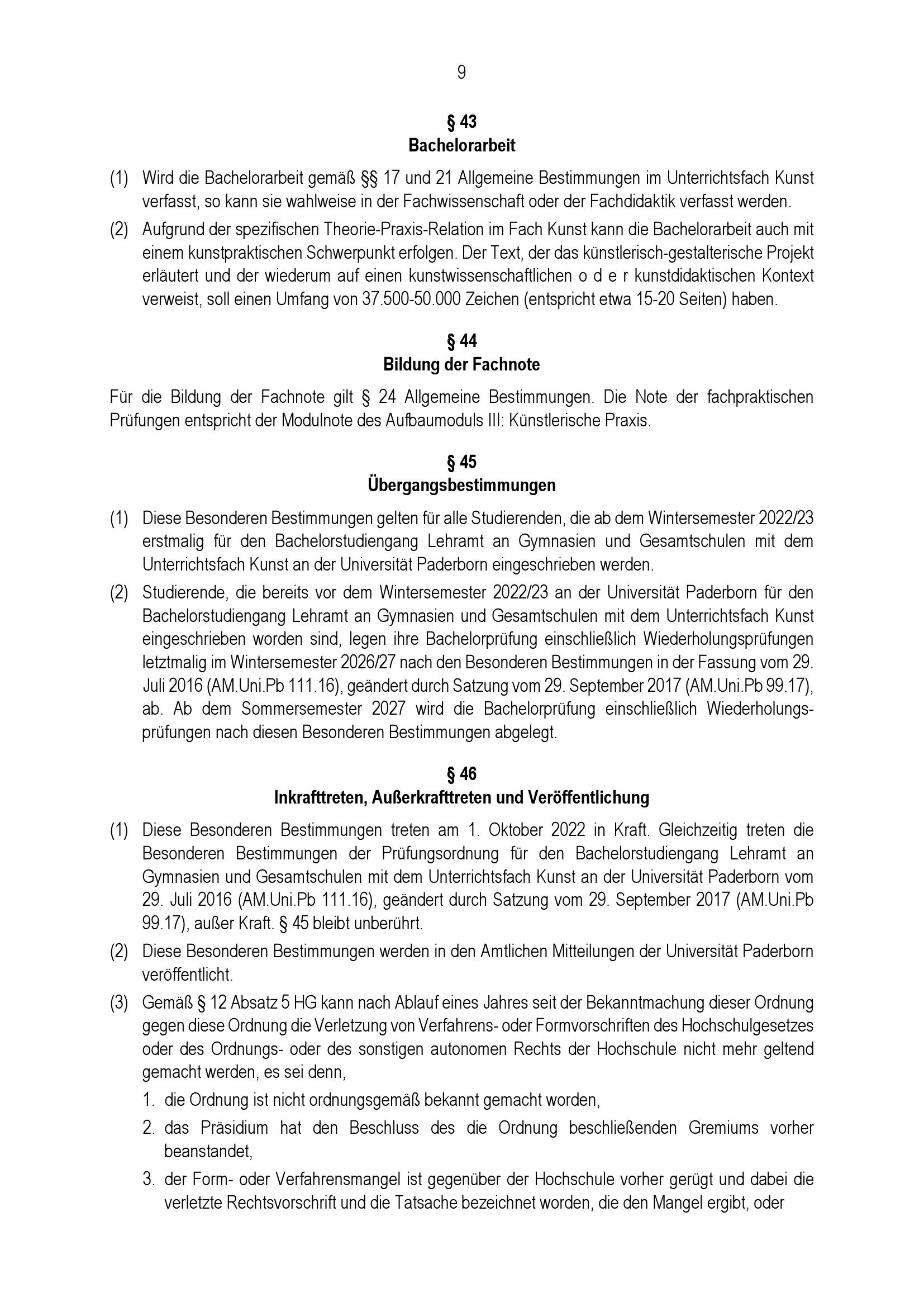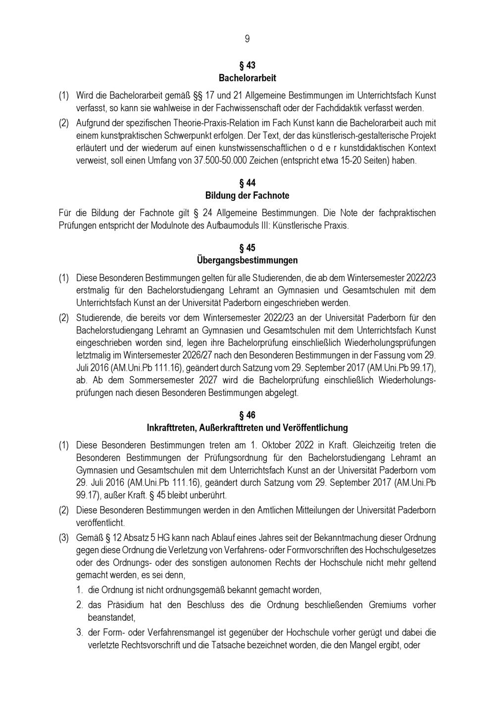 Besondere Bestimmungen der Prüfungsordnung für den Bachelorstudiengang Lehramt an Gymnasien und Gesamtschulen mit dem Unterrichtsfach Kunst an der Universität Paderborn : vom 31. Mai 2022