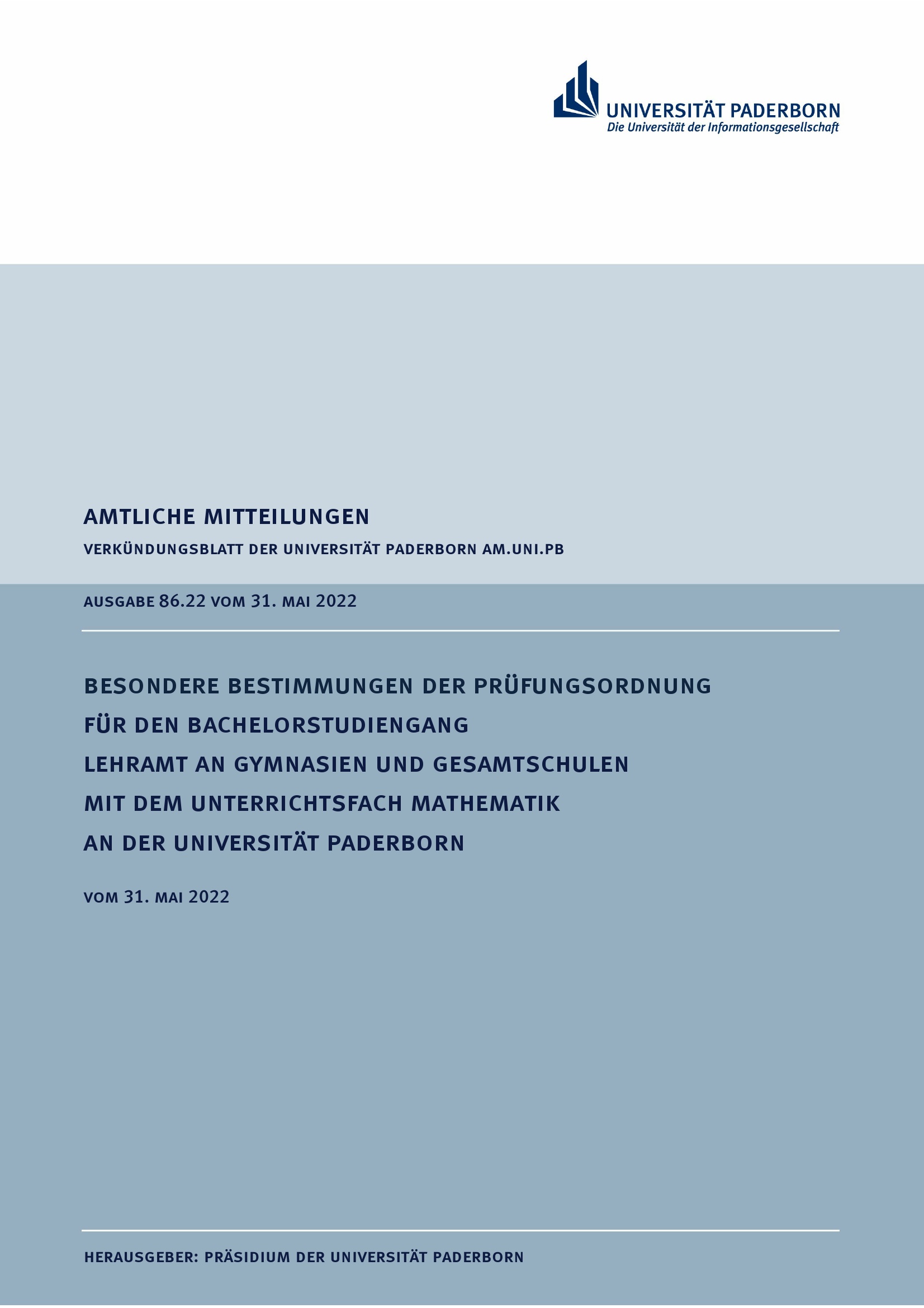 Besondere Bestimmungen der Prüfungsordnung für den Bachelorstudiengang Lehramt an Gymnasien und Gesamtschulen mit dem Unterrichtsfach Mathematik an der Universität Paderborn : vom 31. Mai 2022