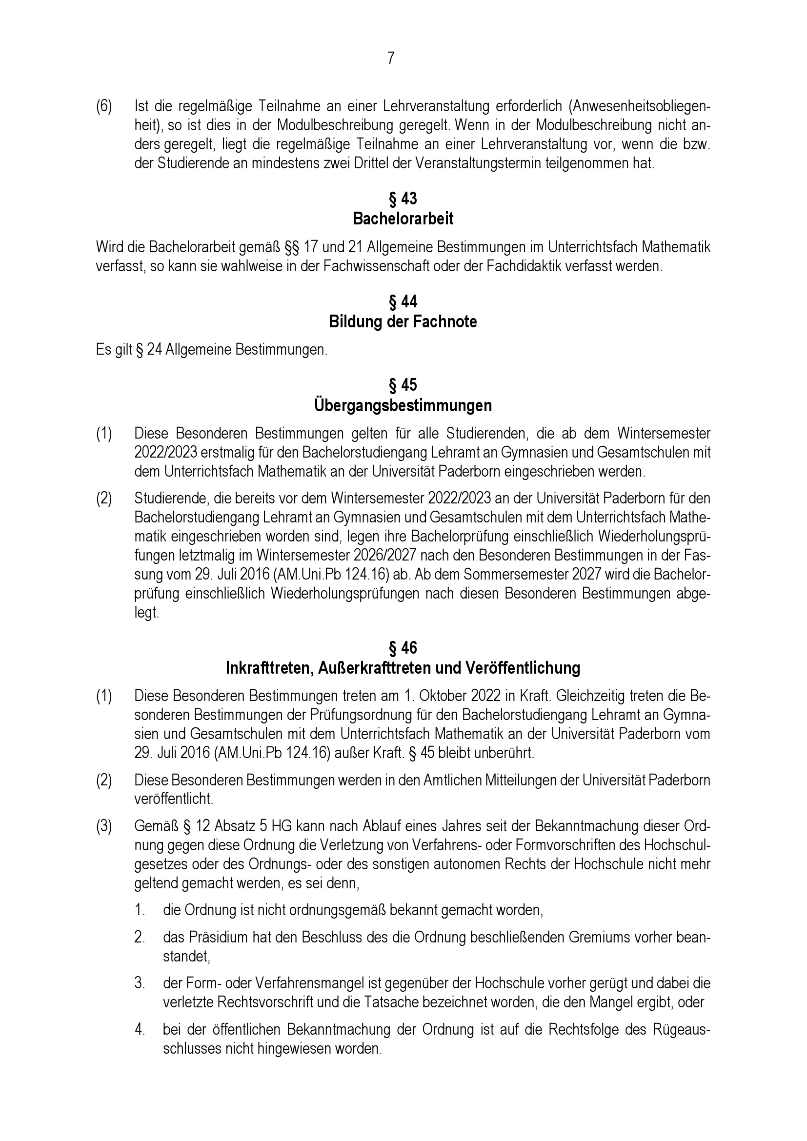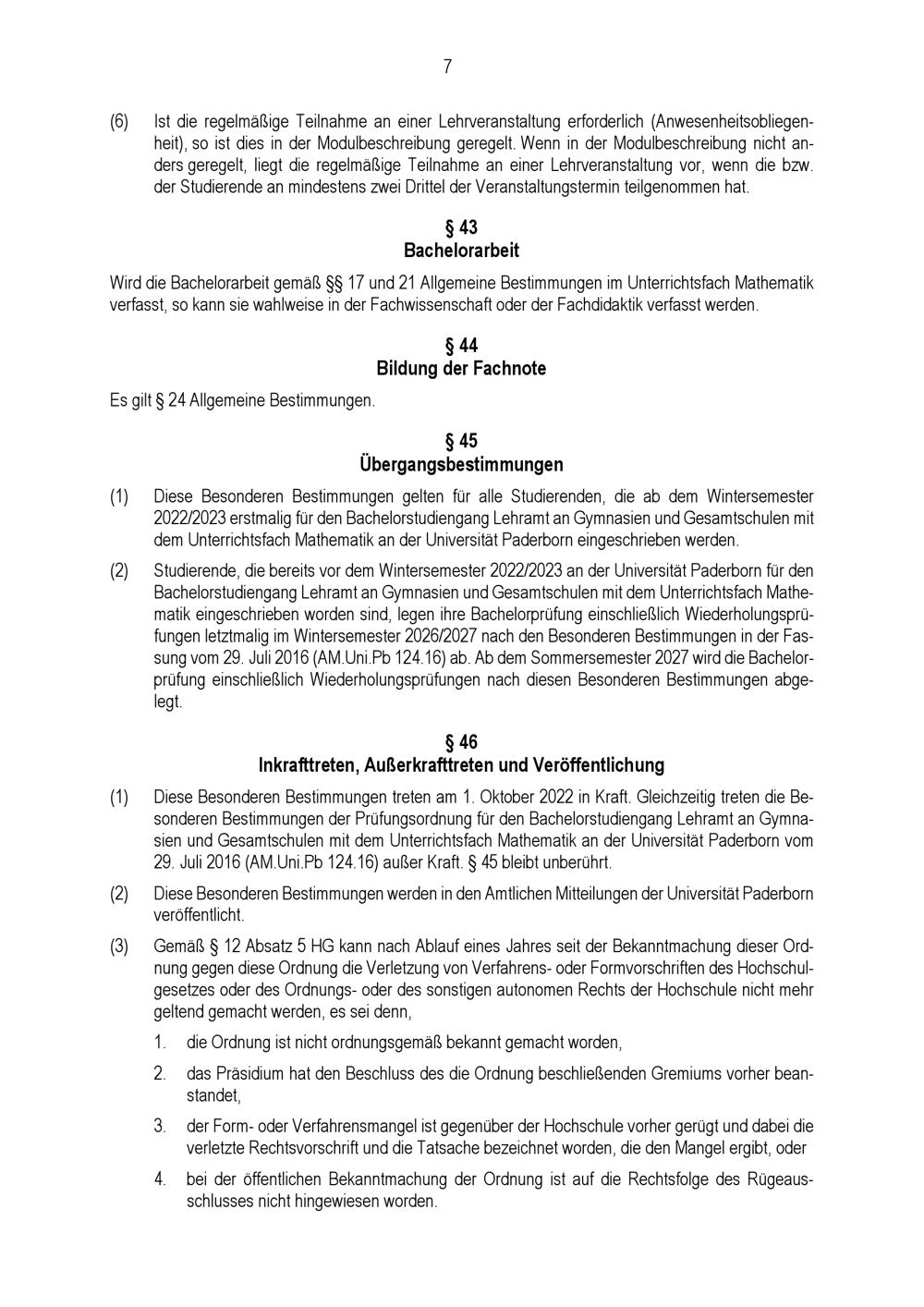 Besondere Bestimmungen der Prüfungsordnung für den Bachelorstudiengang Lehramt an Gymnasien und Gesamtschulen mit dem Unterrichtsfach Mathematik an der Universität Paderborn : vom 31. Mai 2022
