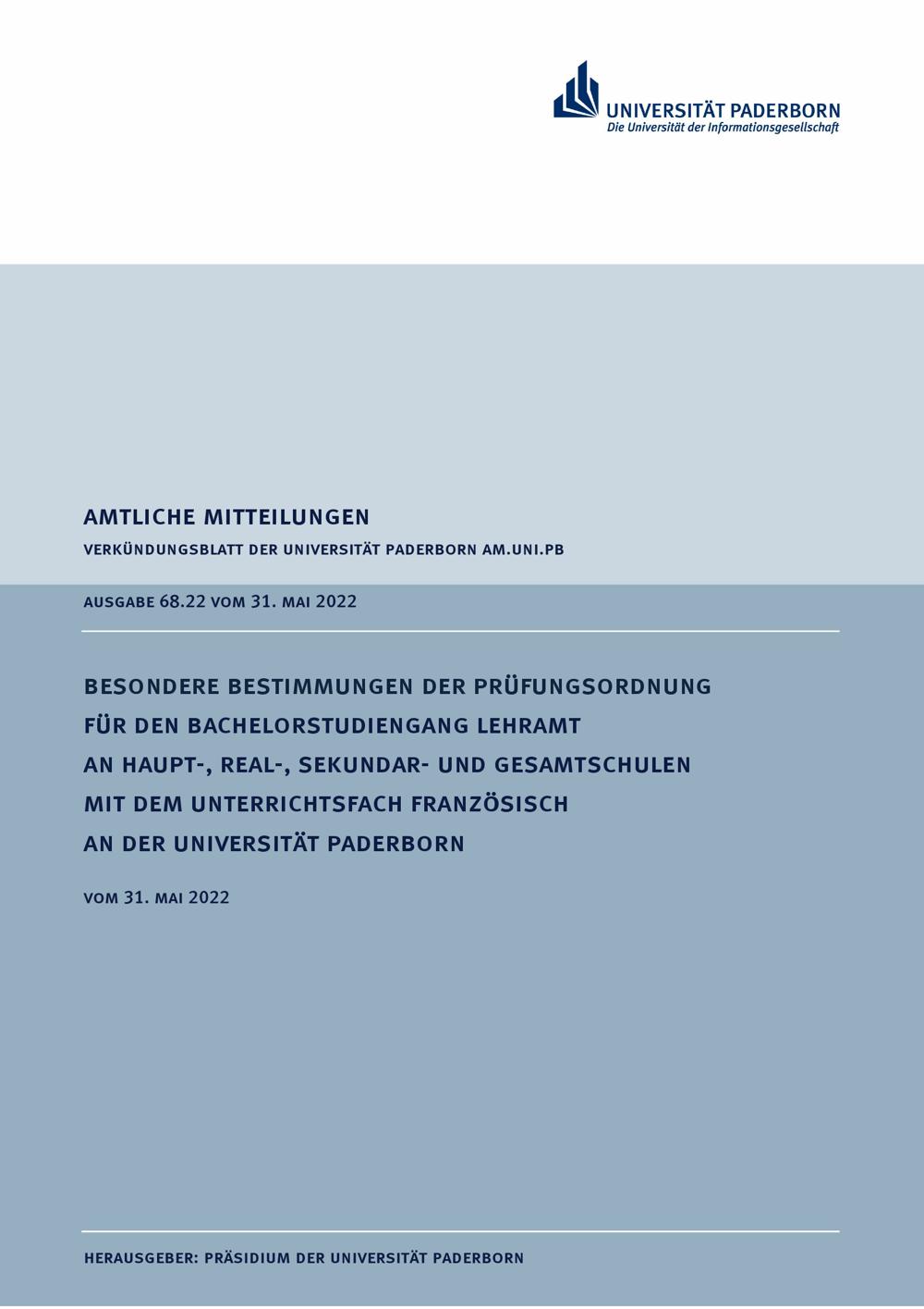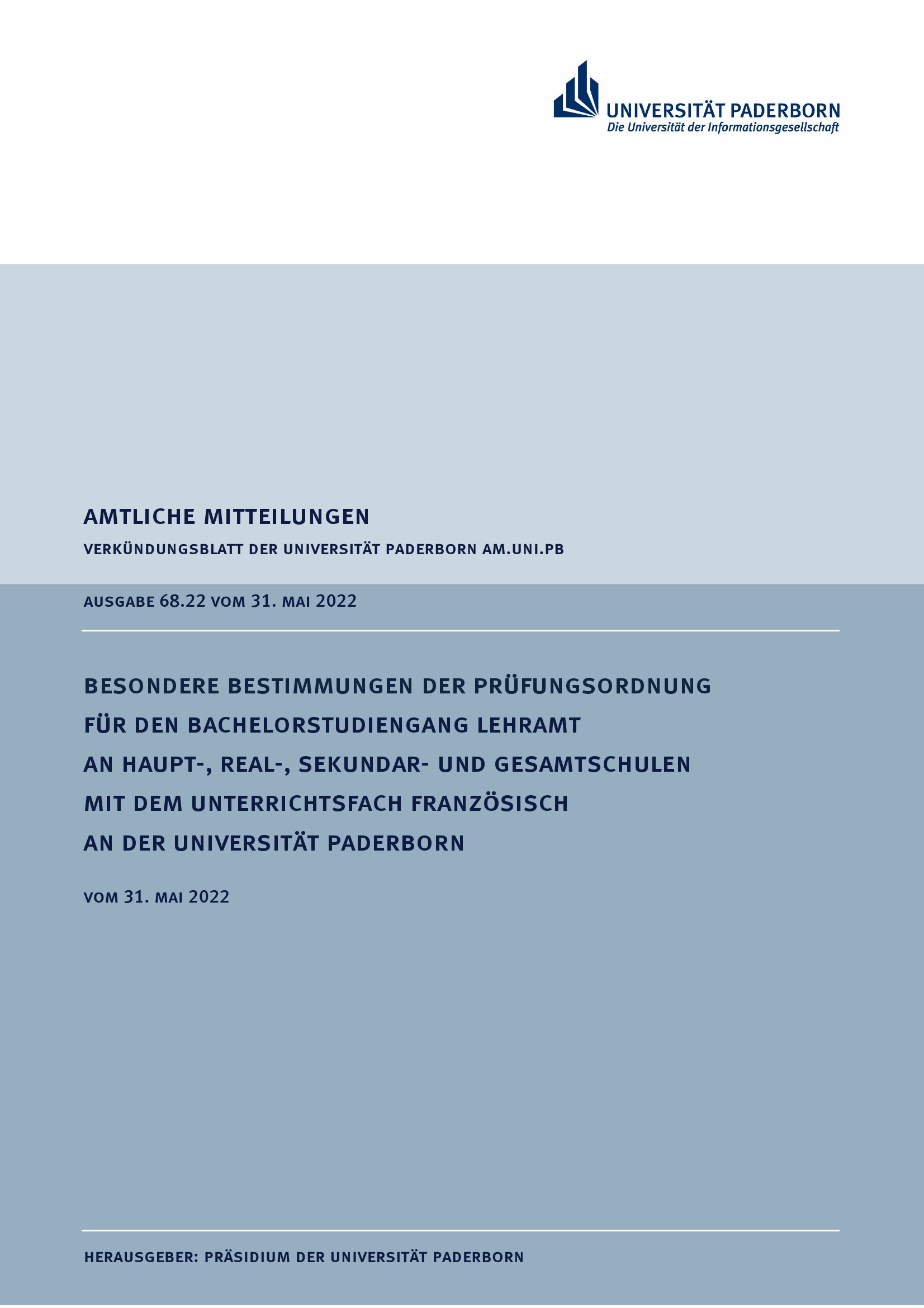 Besondere Bestimmungen der Prüfungsordnung für den Bachelorstudiengang Lehramt an Haupt-, Real-, Sekundar- und Gesamtschulen mit dem Unterrichtsfach Französisch an der Universität Paderborn : vom 31. Mai 2022