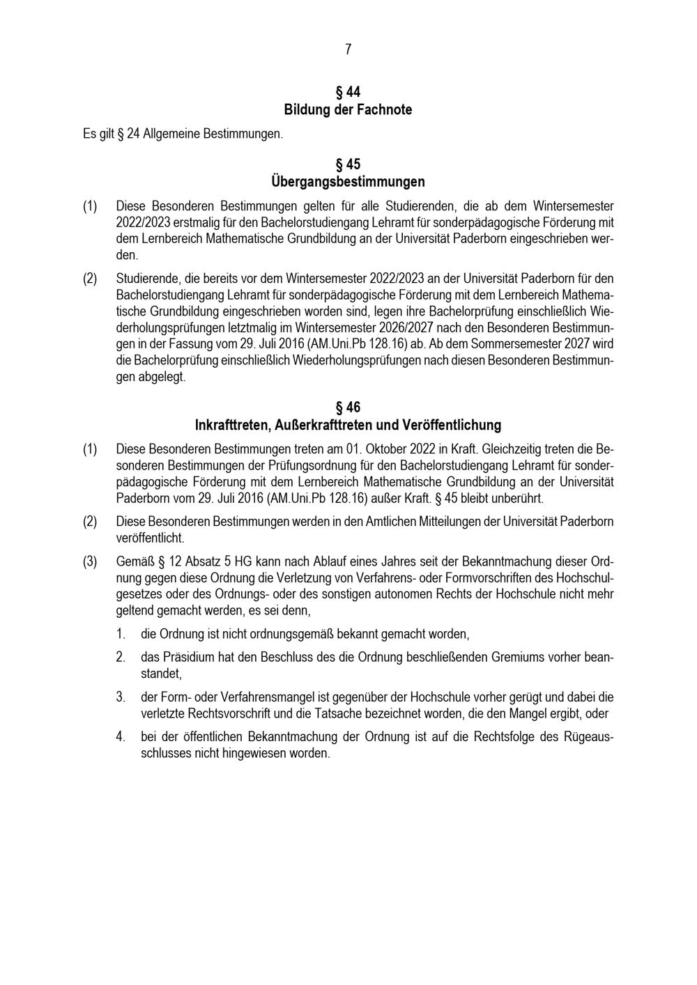 Besondere Bestimmungen der Prüfungsordnung für den Bachelorstudiengang Lehramt für sonderpädagogische Förderung mit dem Lernbereich Mathematische Grundbildung an der Universität Paderborn : vom 31. Mai 2022