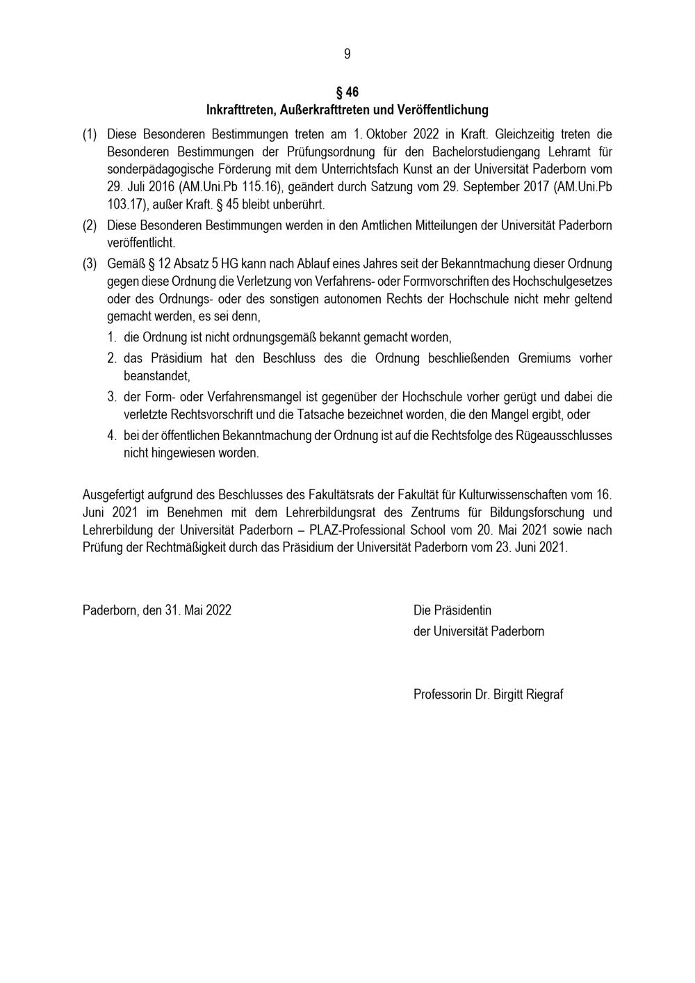 Besondere Bestimmungen der Prüfungsordnung für den Bachelorstudiengang Lehramt für sonderpädagogische Förderung mit dem Unterrichtsfach Kunst an der Universität Paderborn : vom 31. Mai 2022
